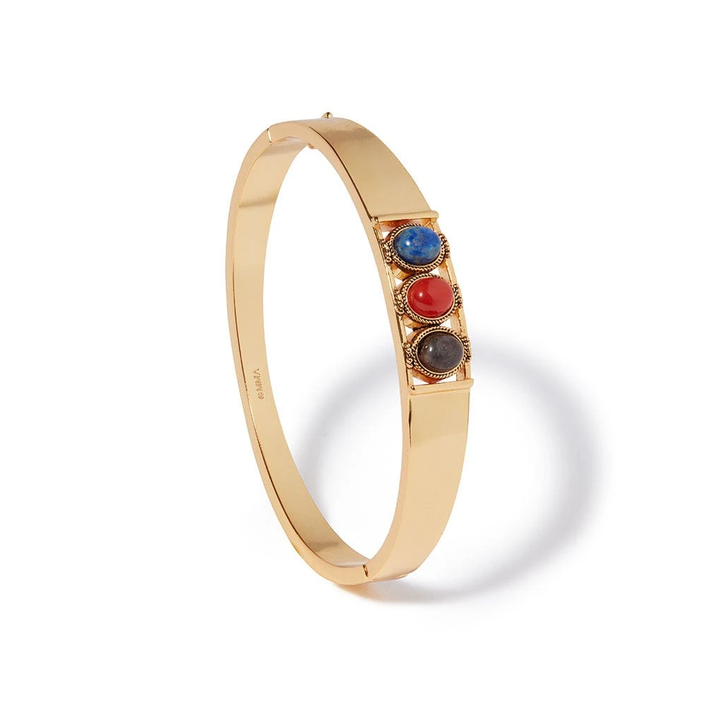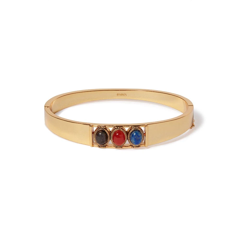 This bracelet pays tribute to a rare gold ring in the Greek and Roman Study Collection at The Met. Produced in Cyprus in the 6th century B.C., this precious ring displays impressive aspects of the ancient goldsmith’s art. The ring bears two of its three original insets: a piece of sard (quartz) and a “stone” of glass paste, which would have presented a pleasing color contrast with the third element. Our bracelet reimagines this ancient adornment with gray aventurine, carnelian, and lapis stones.