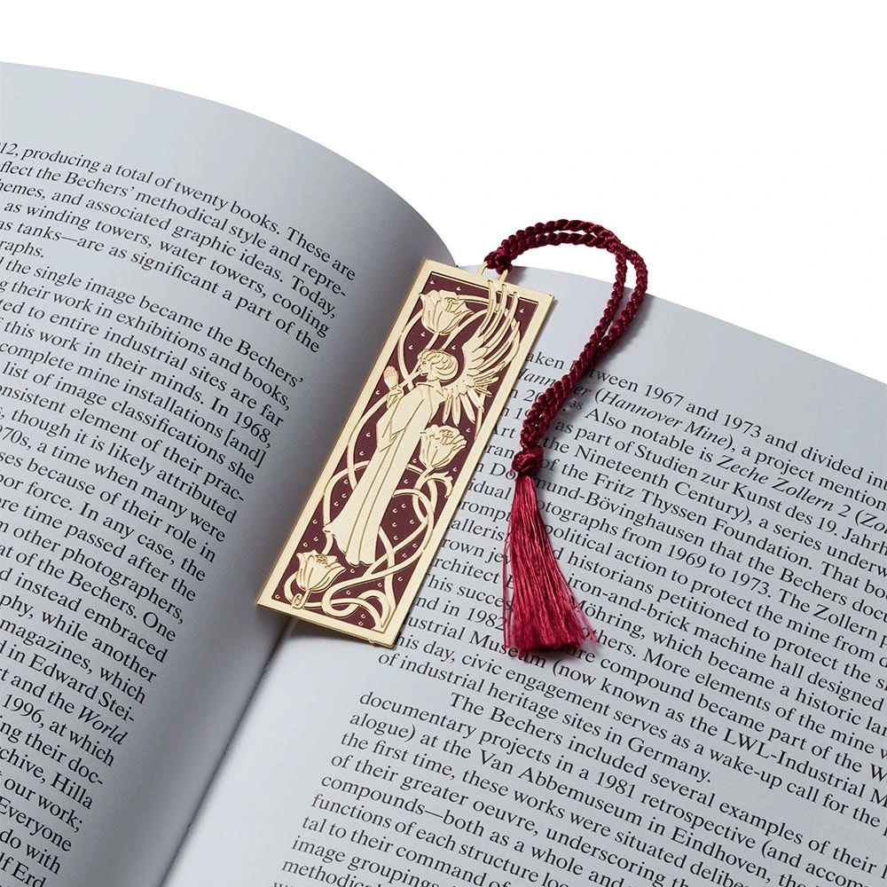 The elegant praying angel on this bookmark comes from a pen-and-ink border design by Aubrey Vincent Beardsley (British, 1872–1898) in The Met collection. One of hundreds of detailed ink drawings that Beardsley made to illustrate J. M. Dent’s 1893–94 edition of Thomas Malory’s 15th-century book, Le Morte d’Arthur, this particular design framed a tale of King Arthur’s piety in book seven, chapter one, titled, “How Beaumains Came to King Arthur’s Court and Demanded Three Petitions of King Arthur.” Beardsley evoked the chapter’s theme with angels rendered in a medievalist aesthetic, while the lilies, with their curvilinear stems, anticipate the style of Art Nouveau.