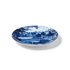 Since the 18th century, the British city of Stoke-on-Trent has been a hub for the manufacture of ceramics. Rich in clay, salt and lead for glazing, and coal for the kilns, the land lent itself to the medium, and played a pivotal role in its evolution into a factory-based industry. The blue-and-white plate (ca. 1824–ca. 1828) informing the motif on our salad plate set was produced by Henshall, Williamson & Co. (British, ca. 1802–28). Made for the American market, the earthenware plate in The Met collection offers an idyllic vista of the Dam and Water Works in Philadelphia, bordered by a lush motif of flowers and fruit.
