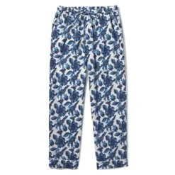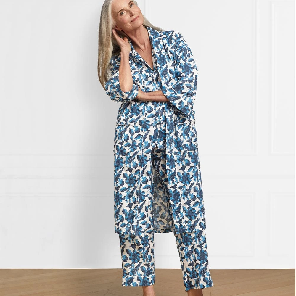 Rest easy—and artfully—in these cozy cotton pajamas, which are presented in a beautifully giftable pouch with a mother-of-pearl enclosure to match the buttons on the top. This eye-catching design is adapted from a blue-resist curtain panel probably created in America around 1725–75. Blue-resist textiles were crafted by applying a dye-resistant substance such as wax around a pattern, and then dipping the cloth in an indigo bath. The origins of blue-resist fabric have long bewildered scholars; once thought to be rare, early American-made printed textiles, they were more likely commissioned from Indian artisans by the English East India Company for export to the colonies, where they were made into bed hangings, quilts, and…See More