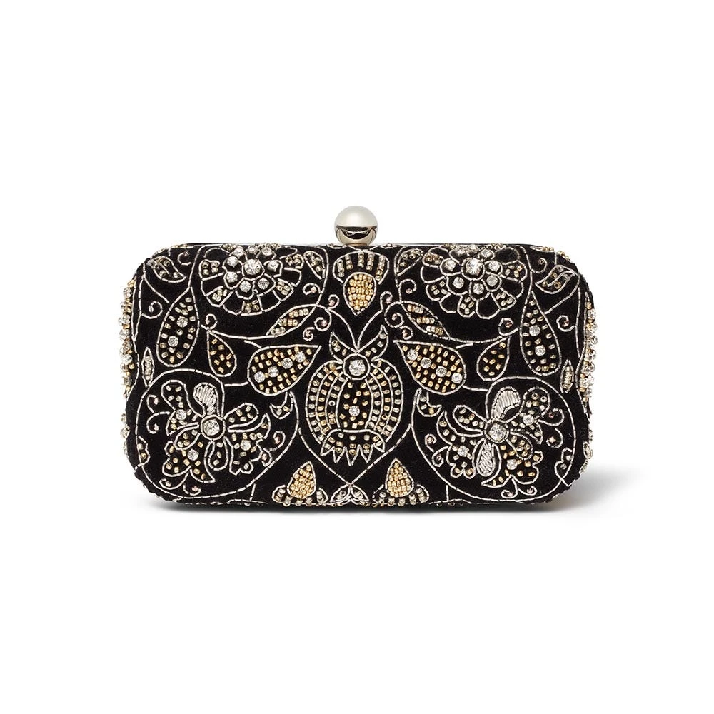 This beaded clutch adapts the elegant design on a British coif—a type of snugly fitting cap—in The Met collection. Crafted between 1575 and 1600, the original linen adornment boasts a floral motif embellished with metal thread and sparkling sequins. Patterns of scrolling vines bearing blooms became popular in late 16th- and early 17th-century England, featuring on men’s and women’s hats, women’s jackets, and textiles.