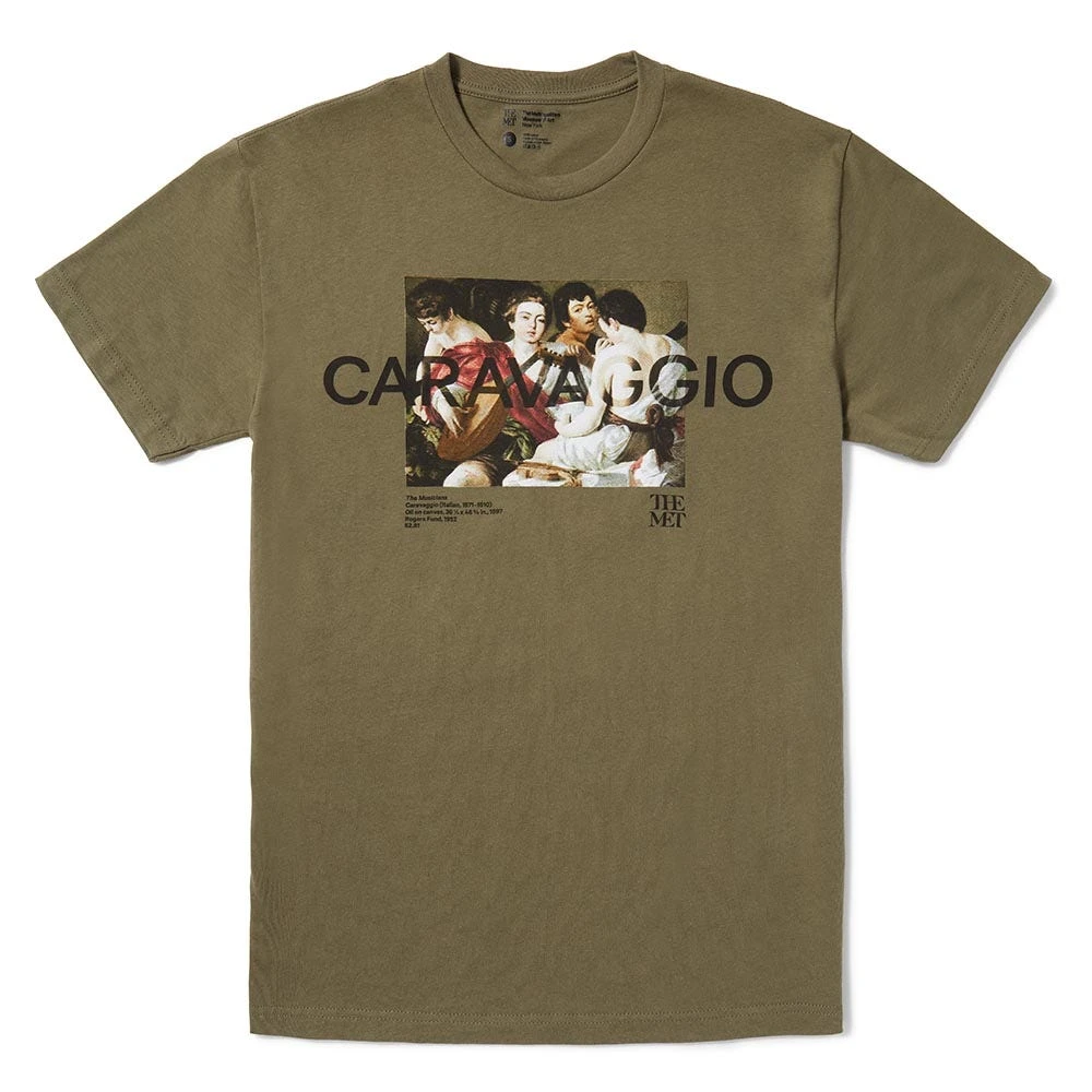 A spectacular painting by Caravaggio (Michelangelo Merisi) (Italian, 1571–1610) features on our Museum-inspired tee. The Musicians (1597) was commissioned by Cardinal Francesco Maria del Monte, the artist’s first great patron in Rome. While the presence of the mythological Cupid, paired with the youths’ classical clothing, indicates that this scene is in fact allegorical, Caravaggio likewise engages with contemporary life. At the time, musical performances were reserved for male singers, and a concert such as this—complete with classical costumes—may well have taken place in the cardinal’s home. Lending another layer of realism to the painting is the artist’s self-portrait in the second figure from the right.