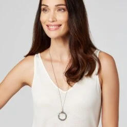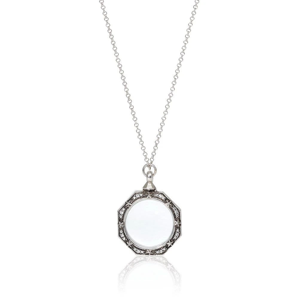 Both elegant and functional, our sparkling octagonal magnifier pendant necklace recalls a fine example of a magnifying glass in The Met collection designed by Louis Comfort Tiffany (American, 1848–1933). Our celestial adaptation in oxidized rhodium plate is adorned with stars and glittering Swarovski® crystals. The glass magnifies 4 x power.