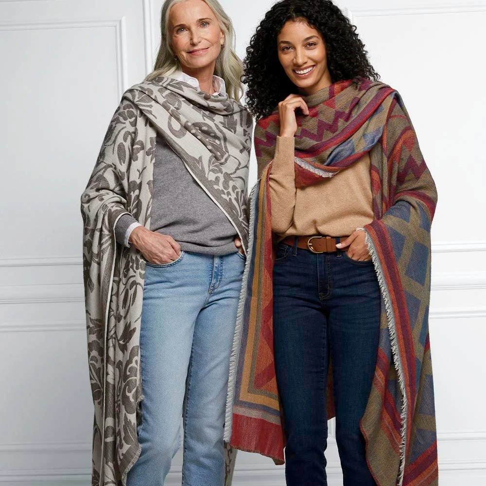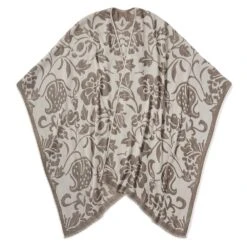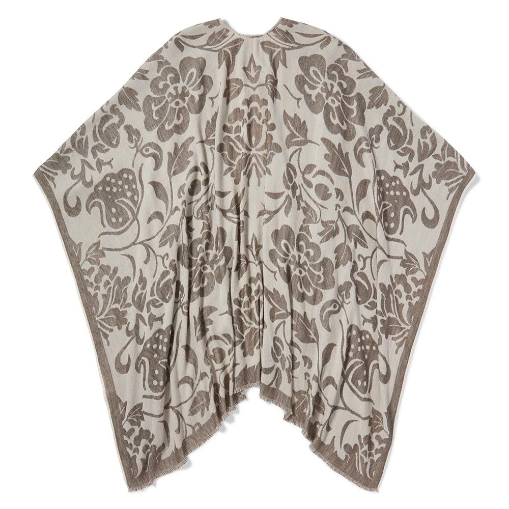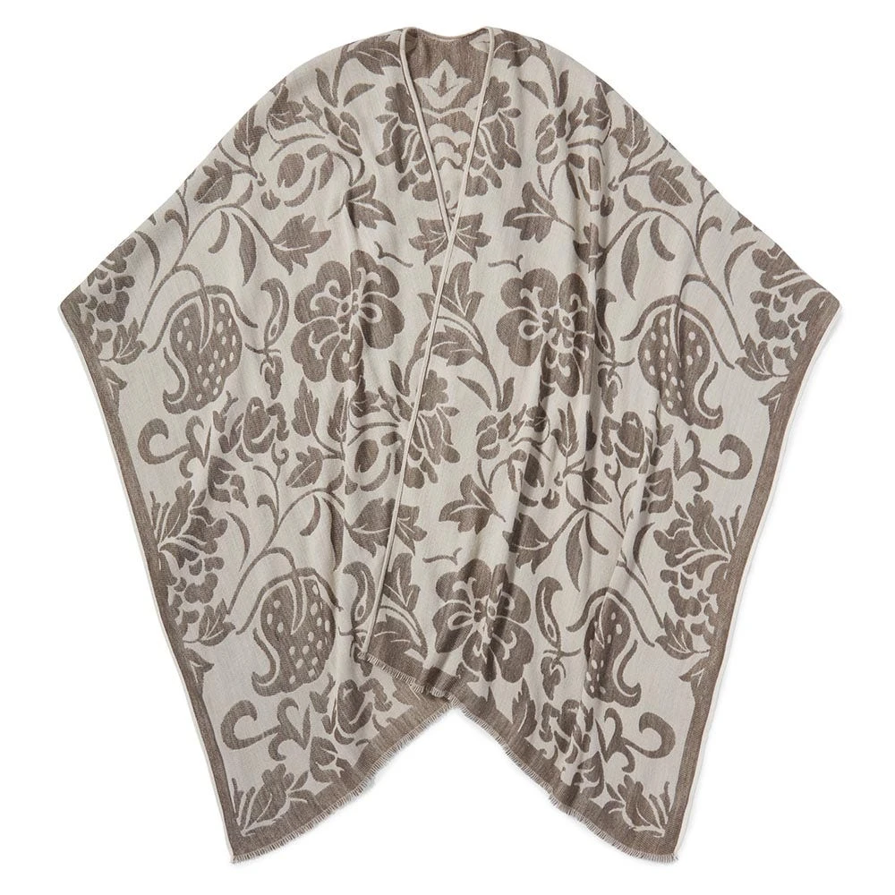 The timeless floral motif on our stylish oversize ruana comes from a silk twill damask textile fragment made sometime between the 11th and 12th centuries during China’s Northern Song dynasty (960–1127). Now in The Met collection, this remarkable piece was meticulously woven with boys tucked amid floral scrolls and lotus pods, which allude to the concept of lineage. The lotus is an enduring symbol of rebirth in the Buddhist tradition; as such, multi-seeded lotus pods serve as emblems of plentiful offspring.