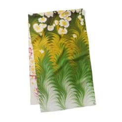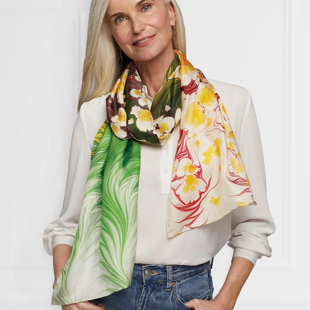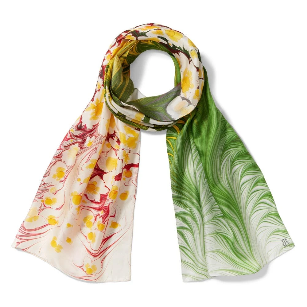 The centuries-old practice of marbling paper yields astounding patterns awash in color. While techniques vary between cultures, marbling typically refers to a method of transferring pigments from the surface of a water bath onto a piece of paper. This tradition is carried forth by the contemporary artists represented in The Paper Legacy Project, an initiative spearheaded by the Museum’s Thomas J. Watson Library to preserve and promote the “Golden Age” of American decorated paper. Featured on our stylish silk scarf, Daisy Garden (ca. 2015) is a modern-day marbled motif by Taiwanese Canadian artist Robert Wu.