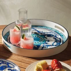 This striking lacquer tray adapts the imagery on a brilliantly embellished plate (ca. 1890–1907) by William De Morgan (British, 1839–1917) for Sands End Pottery (British). Having kicked off his career painting stained glass for the great William Morris (British, 1834–1896), De Morgan developed a keen eye for color; he produced glazes with richer, softer hues than his contemporaries, and became known for his “Persian-style” pottery bearing Iznik influences. The designer was particularly fond of dragons, which he used to anchor the harmonizing motifs on this ceramic creation in The Met collection.