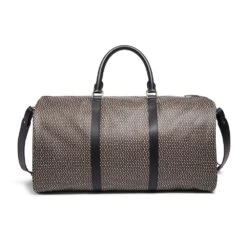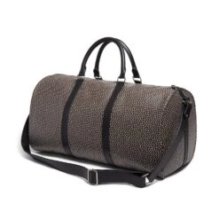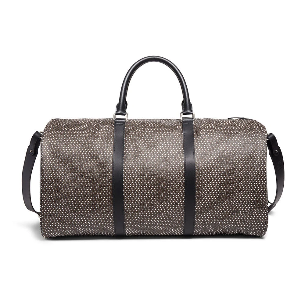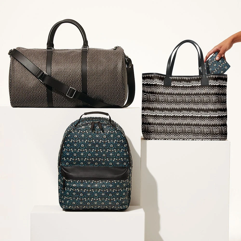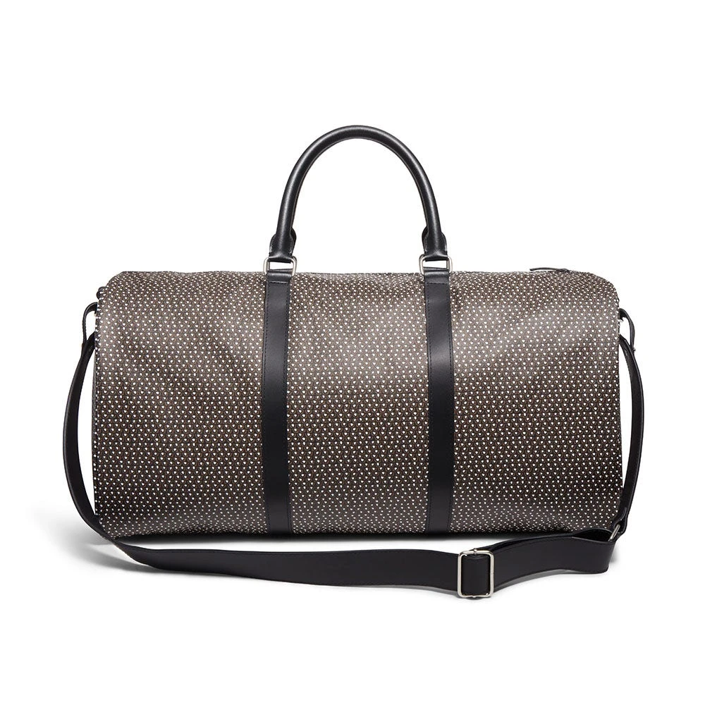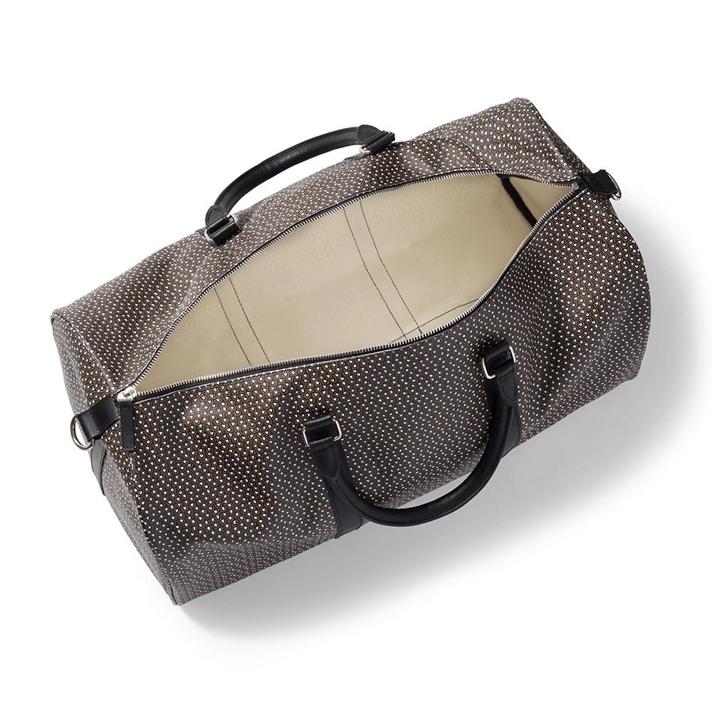 The timeless motif on our coated canvas duffle bag is inspired by a feather-patterned glass inlay (200 B.C–A.D. 100) from Egypt and housed at The Met. The use of a mosaic technique facilitated the repetition on the original fragment; a figural or design composition was made by bundling colored glass canes, which were drawn out into a long bar. The bar was then sectioned at right angles to produce small inlay tiles.