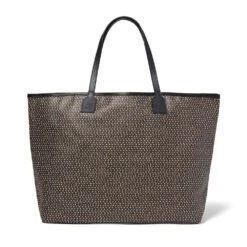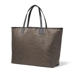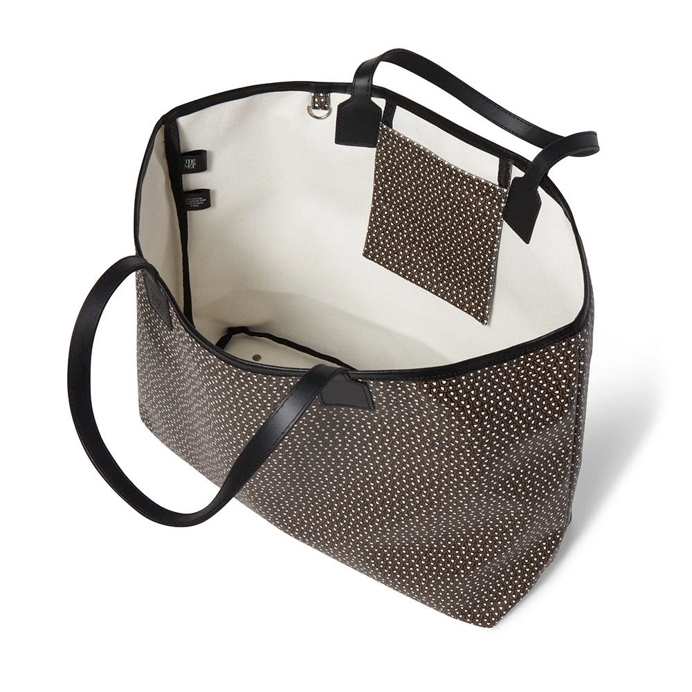 Our coated canvas tote reinterprets the eye-catching feather pattern on a glass inlay (200 B.C–A.D. 100) from Egypt in The Met collection. The use of a mosaic technique facilitated multiples of an image on the original; a figural or design composition was made by bundling colored glass canes, drawn out into a long bar which was then sectioned at right angles to produce small inlay tiles.