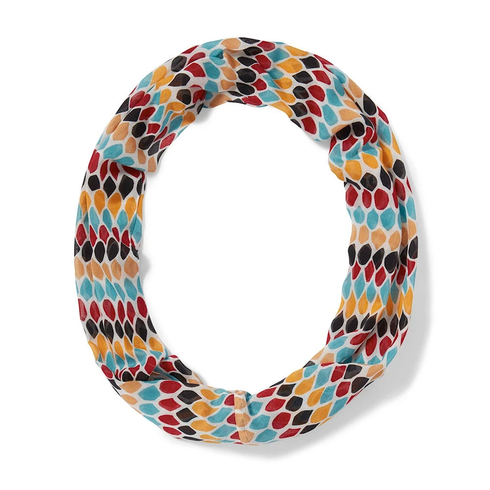 The pattern on this infinity scarf celebrates a small masterpiece of Egyptian woodcarving (ca. 1981–1975 B.C.) in The Met collection. Discovered in the tomb of the king’s chief steward, Meketre, this statue of a richly adorned woman carries a basket of food on her head, personifying an estate that would have provided sustenance for Meketre’s spirit in perpetuity. Her dress’s feather pattern is often found in representations of goddesses.