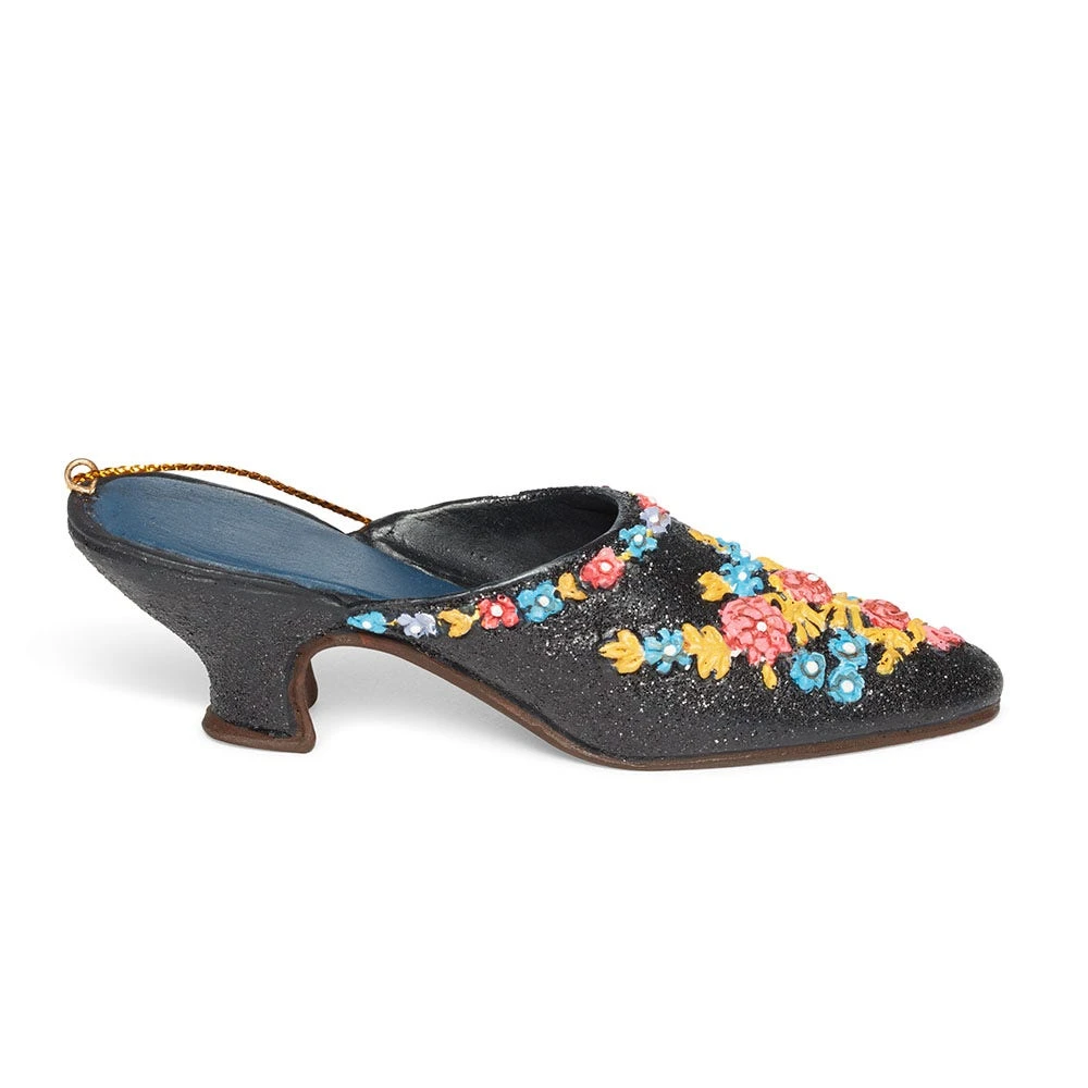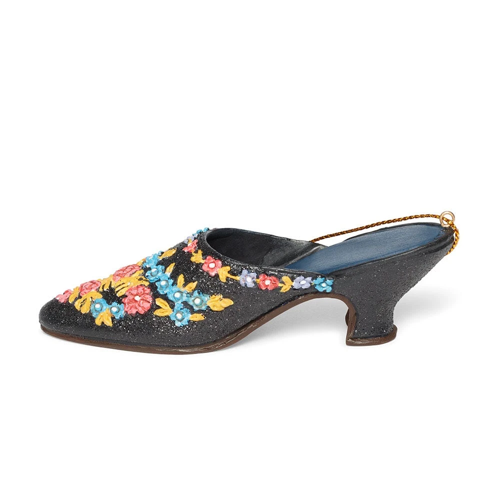 The Embroidered Mule Shoe Ornament is based on a pair of American or European mules (ca. 1927). We’ve reinterpreted the original black shoes, embellished with a striking floral design, into a hand-painted ornament.