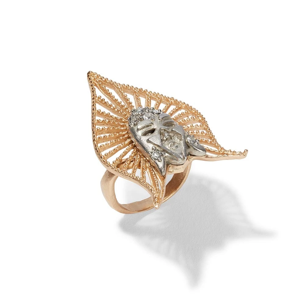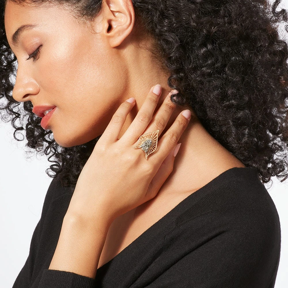 The motif on our ring references a drawing for a brooch resembling a dramatic headdress. Romain de Tirtoff (French, b. Russia, 1892–1990), better known as Erté, enjoyed a multifaceted career as a designer of fabulous costumes and sets. He was likewise renowned for his dramatic Harper’s Bazaar magazine covers. The Met houses an important collection of Erté’s original gouaches.