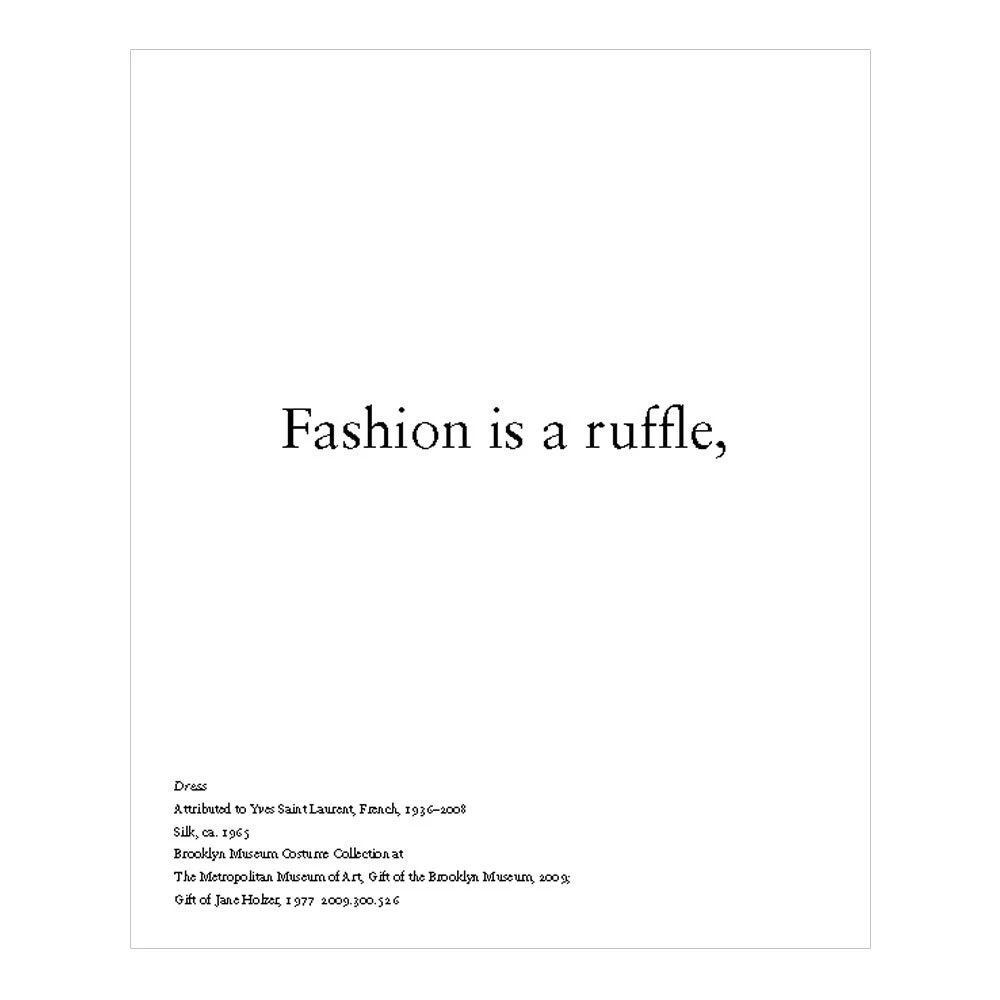 This engaging book from The Metropolitan Museum of Art offers nearly two hundred illustrated definitions of fashion, all presented as simple, concise observations and reactions: A Givenchy gown is made to order, a Diane von Furstenberg dress is ready-to-wear. A Rodarte dress is punk, an Anne Fogarty day dress and coat is polite. An eighteenth-century court dress is opulent, a Calvin Klein ensemble is unadorned.