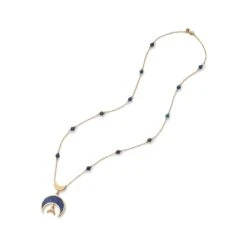 An intricate gold and glass centerpiece (11th century) attributed to Syria lends its crescent motif to our elegant necklace. The original boasts a staff bearing a smaller crescent; granulated, scrolling forms; and a pair of confronting birds—popular in jewelry crafted during the Fatimid dynasty (909–1171)—one of which still maintains its luxurious blue cloisonné enamel, a luxury item in the Byzantine world that may have been exported to Syria and Egypt. Our modern design refines this ornate object in the Museum’s holdings, and reinterprets the blue glass with rich lapis.