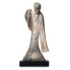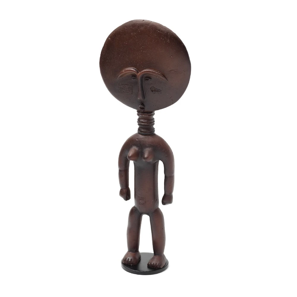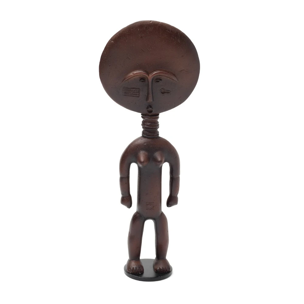 This small resin reproduction depicts an akua ba figure, one of the most recognizable forms in African art. Consecrated by priests, such figures are carried by women who hope to conceive a child. The flat, disk-like head is an exaggerated convention of the Akan ideal of beauty, while the sculpture’s flattened shape allows it to be carried against a woman’s back, wrapped in her skirt. The rings on the figure’s neck signify beauty, health, and prosperity in Akan culture.