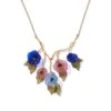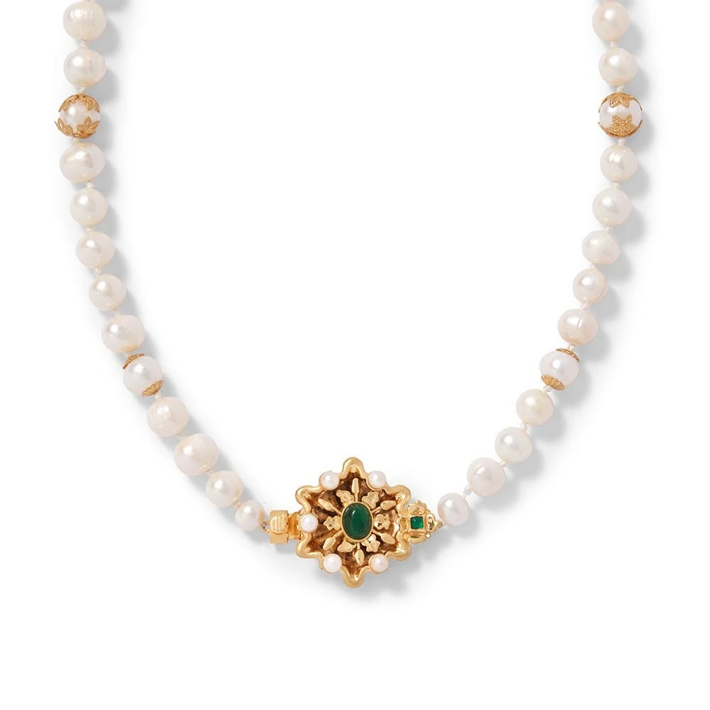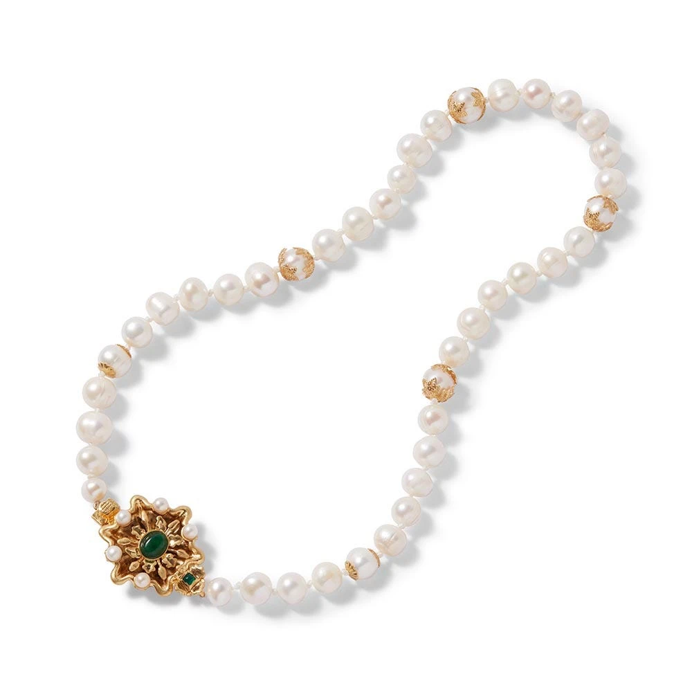 Our eye-catching statement necklace borrows its design from a mid-15th–century French cluster jewel at The Met. Made of gold, pearl, and emerald with the word “amor” (Latin for “love”) suspended in delicate letters along the base, this exquisite adornment may have been worn as either a pendant or a brooch. Some portraits of young women also depict similar pieces exhibited in their hair, or at the shoulder or neck. Such luxurious creations played an important role in betrothal and marriage, serving as magnificent tokens of affection.Â