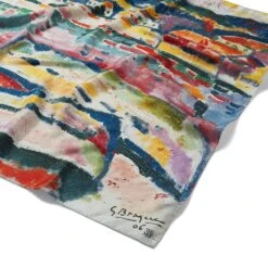 Our silk scarf reproduces a detail from Boats on the Beach at L’Estaque (1906), an evocative oil painting by Georges Braque (French, 1882–1963) in The Met collection. Braque encountered Fauvism at the Salon d’Automne of 1905, after which he briefly experimented with the style. This harbor view of L’Estaque, a Mediterranean fishing village that attracted Braque, as well as André Derain (French, 1880–1954) and Paul Cézanne (French, 1839–1906), exhibits the bright colors, broad outlines, and flattened space of a Fauvist composition.