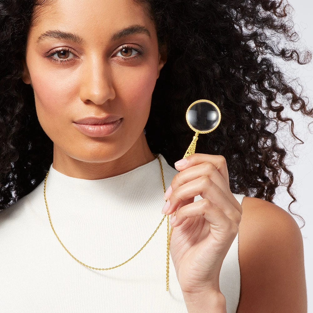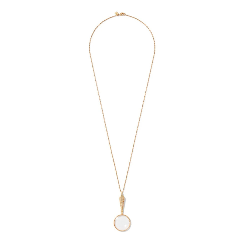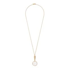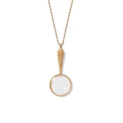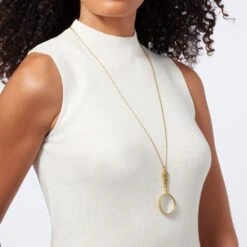 Equal parts elegant and functional, this golden pendant magnifying at 2x power recalls a bronze magnifying glass (ca. 1905–20) designed by Louis Comfort Tiffany (American, 1848–1933) and realized by Tiffany Studios (1902–32). The original piece in The Met collection was likely part of a matching desk set.