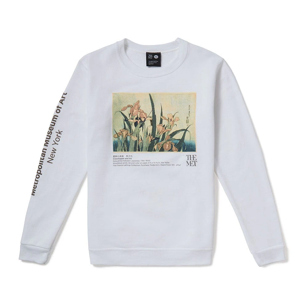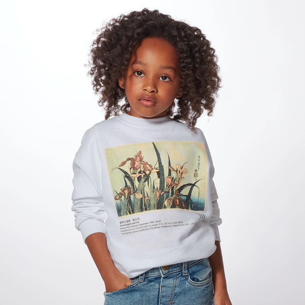 Our kids’ crew neck sweatshirt is elevated with Grasshopper and Iris (late 1820s), a serene nature scene by Katsushika Hokusai (Japanese, 1760–1849). The Edo-period artist was particularly celebrated for his landscapes and nature studies; this meditative picture in The Met collection, showcasing a grasshopper perched on a leaf, is exemplary of Hokusai’s keen eye for detail and technical mastery of woodblock printing.