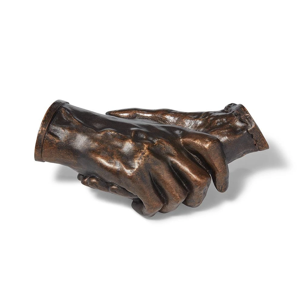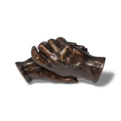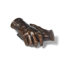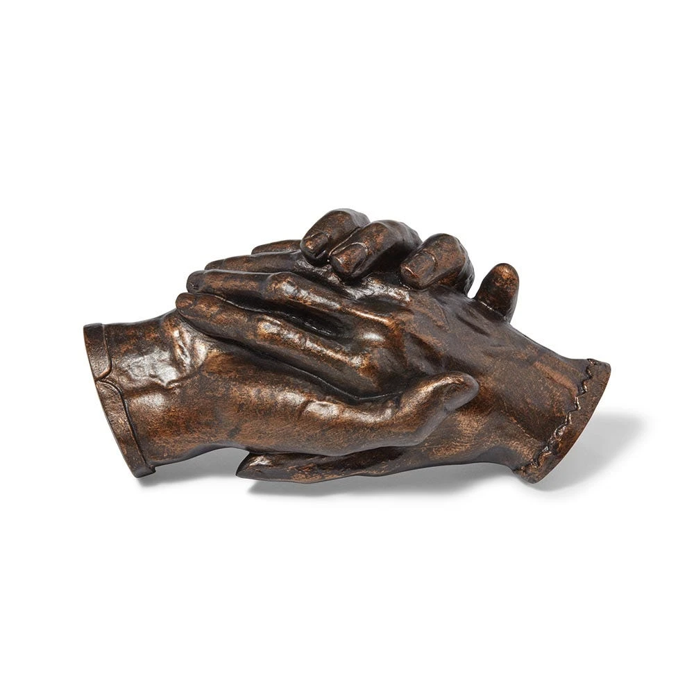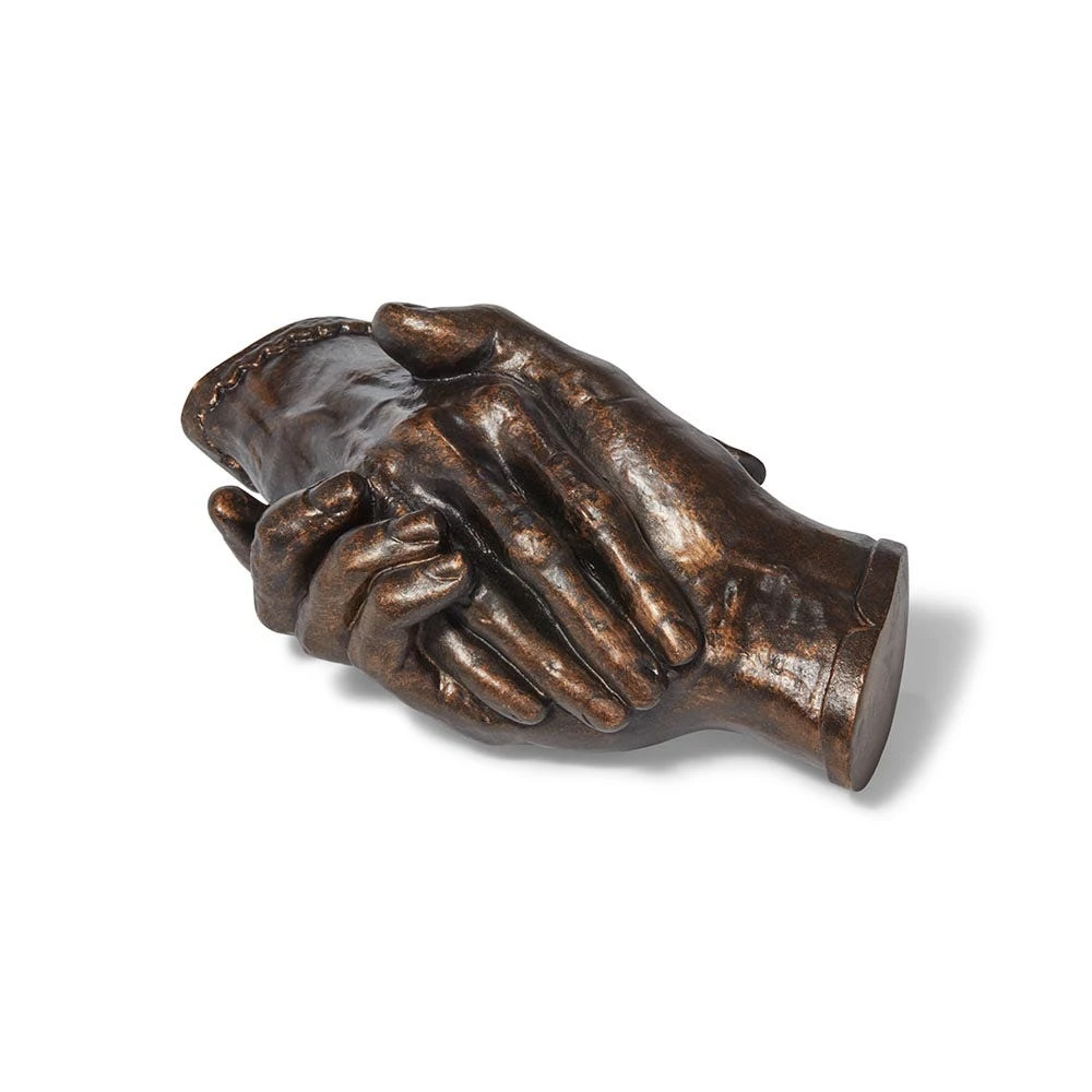 This elegant sculpture reproduces an original bronze cast in The Met collection. In 1852, the sculptor Harriet Goodhue Hosmer (American, 1830–1908) relocated from Watertown, Massachusetts, to Rome, Italy, where she became a prominent member of the Anglo-American expatriate community. In 1853, during her second winter in Rome, Hosmer developed a friendship with British poets Robert (1812–1889) and Elizabeth Barrett Browning (1806–1861). Hosmer suggested making a cast of the poets’ interlocked right hands and Mrs. Browning agreed, provided the artist do it herself, rather than delegate the project to her studio assistants. Mrs. Browning’s delicate hand with a scalloped cuff is entwined in the slightly larger, firmer hand of her husband. Hosmer later noted that the hands appear just…See More