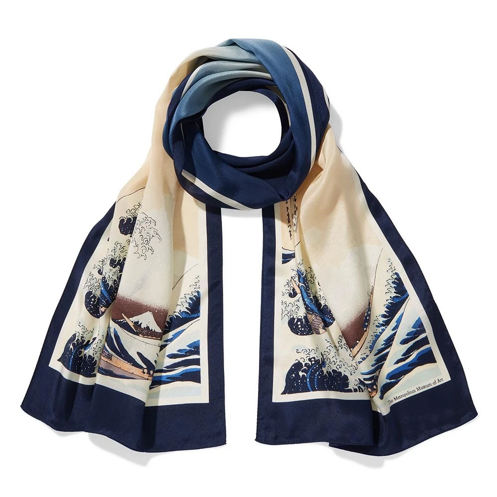 Our versatile oblong scarf in lightweight silk features details from The Great Wave at Kanagawa, the famous polychrome woodblock print by Katsushika Hokusai (Japanese, 1760–1849). The scarf’s graceful elegance will lend timeless beauty to any look.