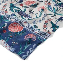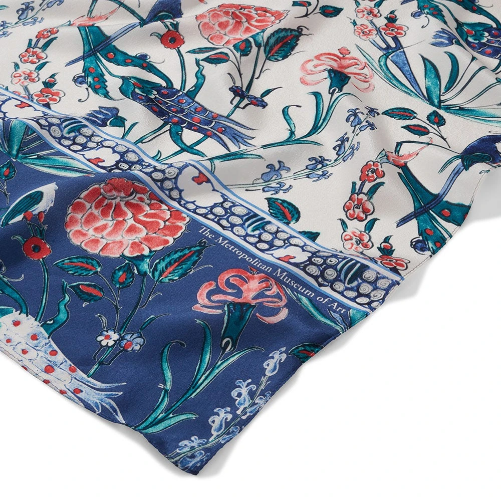 This lush motif is plucked from a remarkable Turkish dish (ca. 1575–90) in the Museum’s Islamic art collection. Forged in the renowned Iznik kilns—illustrious workshops that produced magnificent ceramic wares for the Ottoman court—the dish is adorned with colorful carnations, tulips, and hyacinths, as well as two small birds subtly perched amid the tangle. A popular Ottoman literary trope, birds and flowers were pervasive decorative elements on 16th- and 17th-century Iznik creations.
