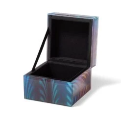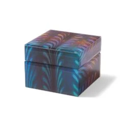 The eye-catching motif on this artful box comes from a Favrile glass vase (ca. 1906) designed by Louis Comfort Tiffany (American, 1848–1933) and housed at The Met. In the late 19th century, the Gilded Age visionary developed a method of blending colors in molten glass, thus achieving subtle effects of shading and texture. He named the results “Favrile” (after the Old English fabrile, meaning “handwrought”) and was duly celebrated for the spectacular opalescent quality of these creations.