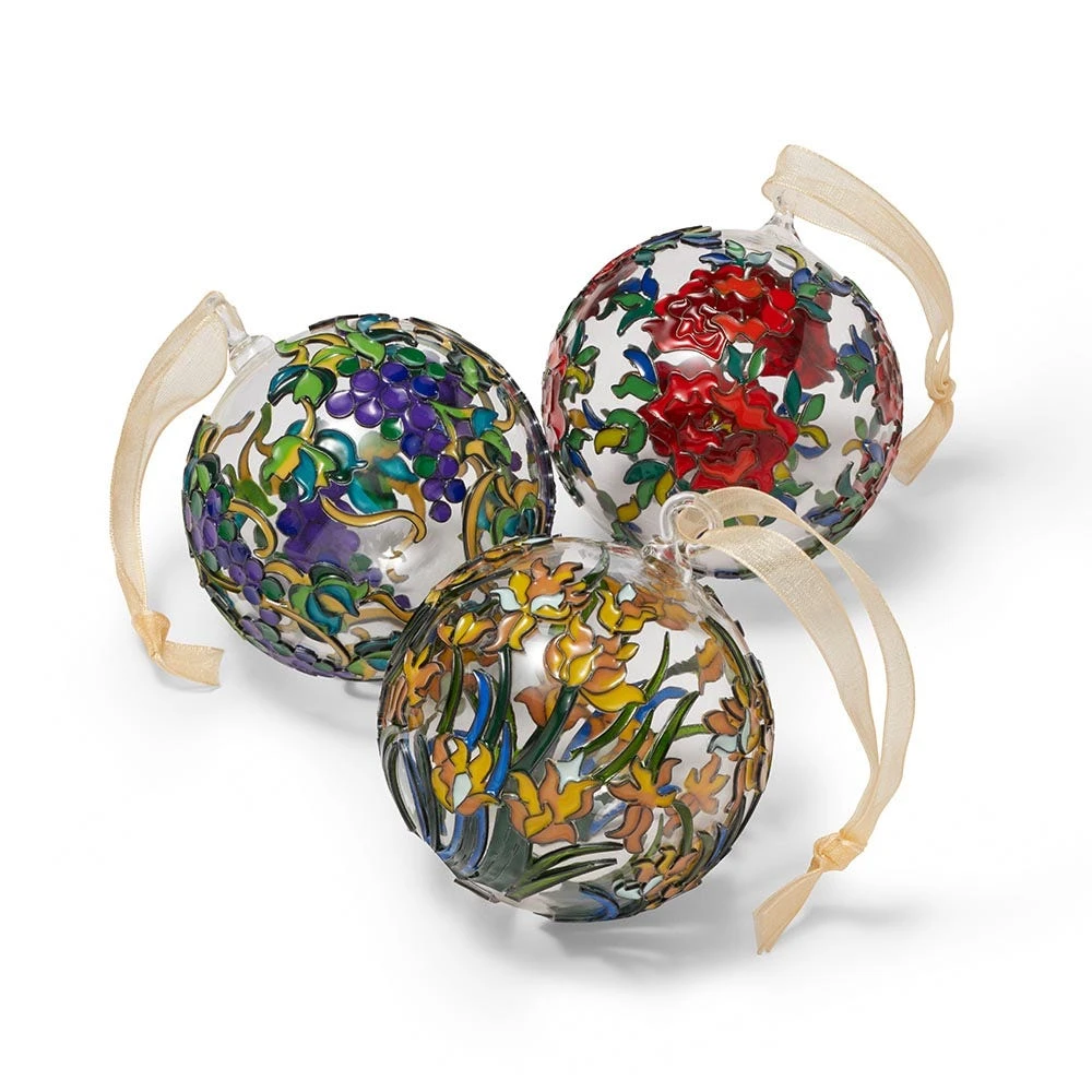 This trio of radiant cloisonné ornaments honors three glass treasures in The Met’s American Wing: a window panel with a grapevine motif (ca. 1902–15) and two elaborate lampshades, one depicting daffodils (ca. 1904–10) and another portraying peonies (1904–15). Each luminous triumph of decorative art reflects Tiffany Studios’s (American, 1902–32) mastery of the craft, as well as Louis Comfort Tiffany’s (American, 1848–1933) reverence for the natural world as an endless source of inspiration.
