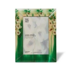 Radiant spears of white gladioli reach along our elegant glass frame inspired by the Art Nouveau decoration on a Favrile vase (ca. 1909) by Louis Comfort Tiffany (American, 1848–1933). In the 1890s, the Gilded Age designer developed a method of blending colors in glass while it was still in a molten state. The iridescent results, which he named “Favrile” after the Old English fabrile, meaning “hand-wrought,” allowed for subtle effects of shading and texture. The designer never sold this vessel, now at The Met; rather, he kept it in his own collection.