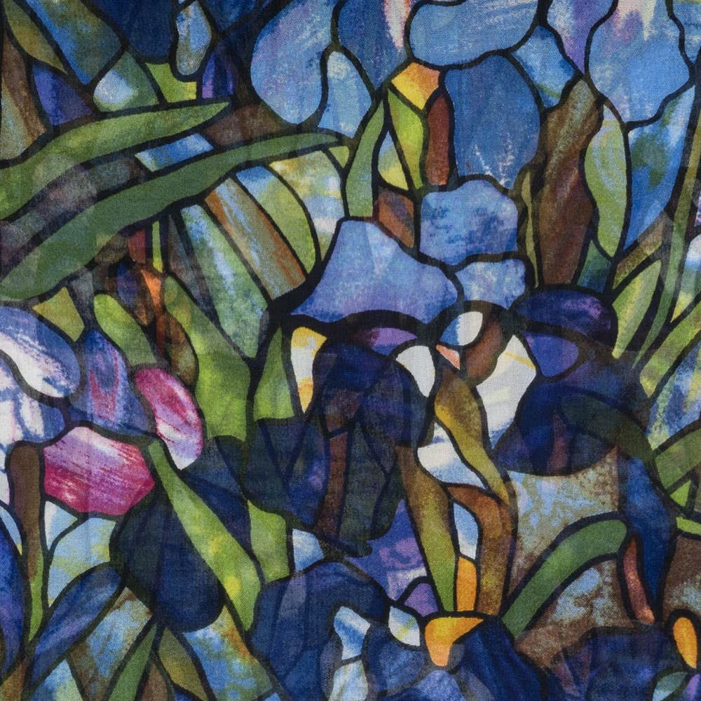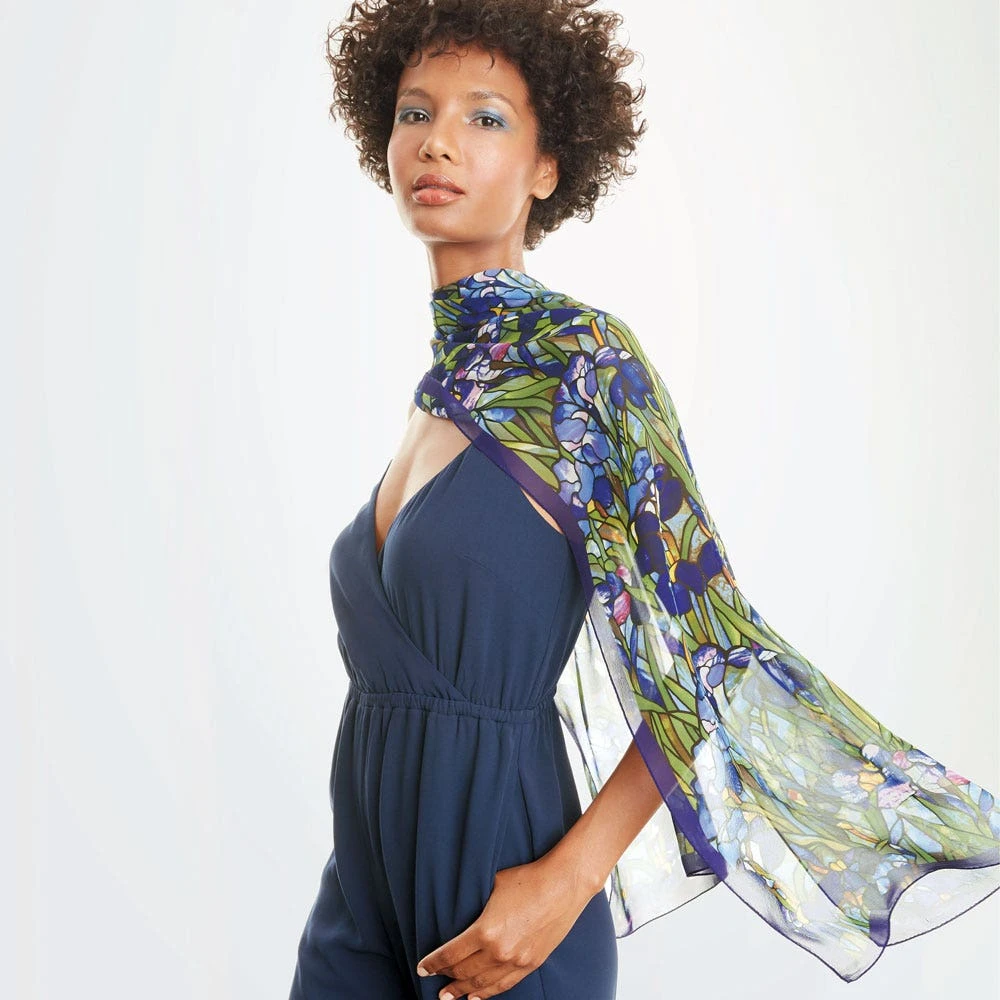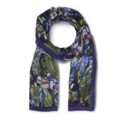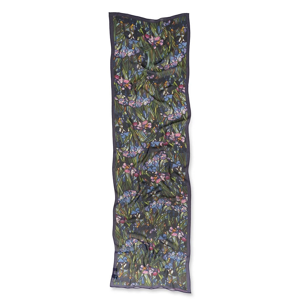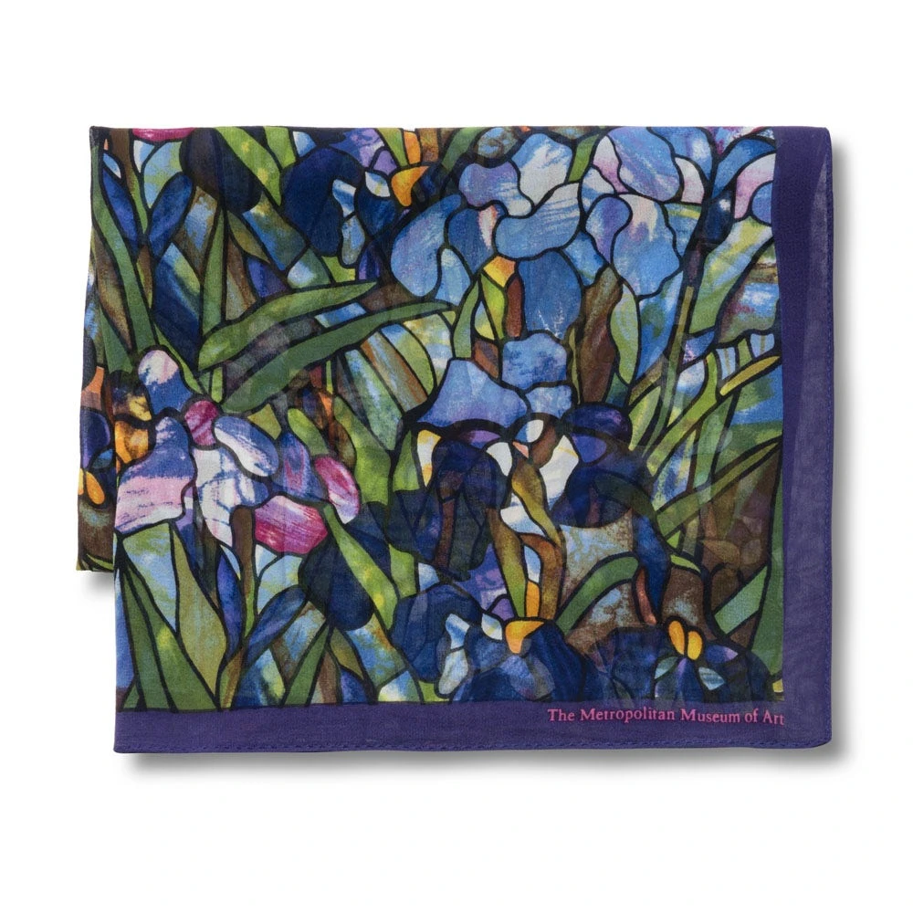 Featuring lush, radiant colors, the Museum’s scarf is based on Louis Comfort Tiffany’s (American, 1848–1933) Magnolias and Irises Favrile glass window depicting a picturesque landscape. The window features an embankment of irises beneath flowering magnolia trees. Magnificent purple hills with a central meandering stream, emblematic of the River of Life theme, are set in the background.