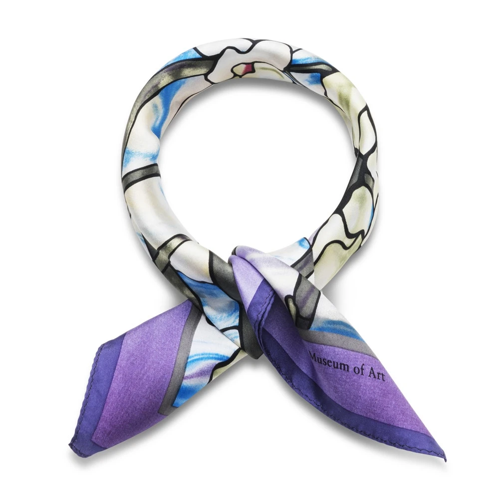 Featuring lush, radiant colors, the Museum’s Magnolias and Irises Neckerchief is based on an original Louis Comfort Tiffany (American, 1848–1933) Favrile glass window depicting a picturesque landscape. The window features an embankment of irises idly situated beneath flowering magnolia trees in the foreground. Magnificent purple hills are set in the background with a central meandering stream, possibly emblematic of the river of life. This piece exemplifies Louis Comfort Tiffany’s lifelong fascination with light, color, and nature.