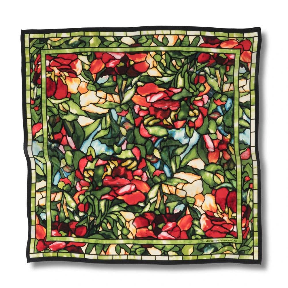 Our silk neckerchief is based on an elaborate lampshade by Louis Comfort Tiffany (American, 1848–1933) in the Museum’s collection that is decorated with brightly colored peony blossoms amidst rich, leafy foliage.