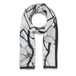 Louis Comfort Tiffany (American, 1848–1933) was one of America’s most noted decorative artists at the turn of the twentieth century. He designed the brilliant five- paneled Magnolia window (ca. 1885) for the Tiffany mansion at 72nd Street and Madison Avenue in New York where it was placed in the grand library. Divided by heavy leading, the window includes sections composed of graceful blossoming branches with pearly leaves and yellow and silver-gray leaf buds primed to open. Our elegant scarf features a detail adapted from this stunning window.