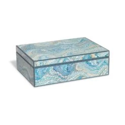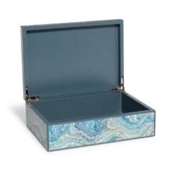 The centuries-old practice of marbling paper yields astounding patterns. Some designs are spontaneous, others are controlled; and while techniques vary between cultures, marbling typically refers to a method of transferring colors from the surface of a water bath onto a piece of paper. This tradition is carried forth by the contemporary artists represented in The Paper Legacy Project, an initiative spearheaded by the Museum’s Thomas J. Watson Library to preserve and promote the “Golden Age” of American decorated paper. The mesmerizing design on this sophisticated lacquer box is Paper Legacy Project artist Faith Harrison’s Wave pattern from 1988.