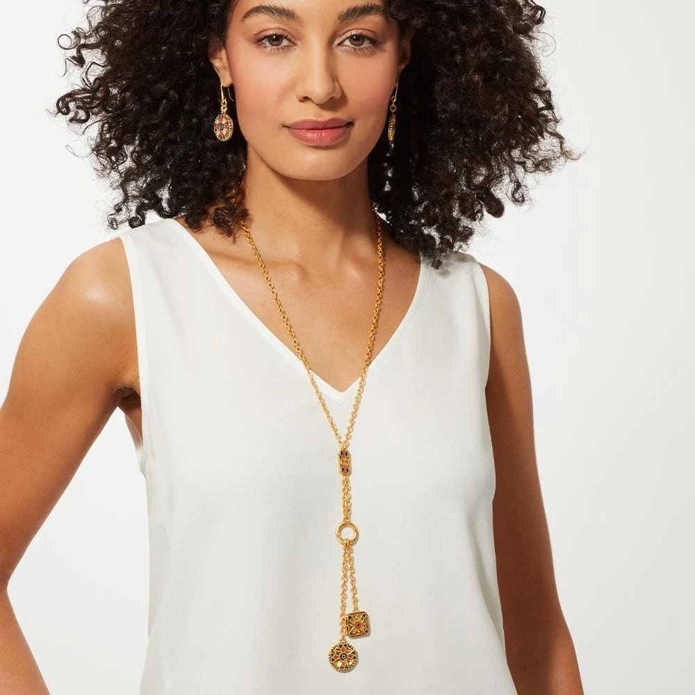 These artful earrings pay tribute to the enduring magnificence of Byzantine adornments. A necklace reconstructed with beads that likely date back to the 10th century in The Met collection exemplifies the Byzantine taste for sumptuous detailing and color, and serves as the inspiration behind our eye-catching collection.