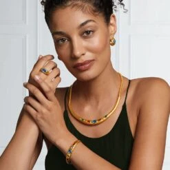 This artful ring reinterprets a 7th-century Frankish disk brooch with red garnets and blue glass embellishments at The Met. Brooches were central to the evolution of Frankish fashion; between the 300s and 500s, women turned to pairs of small brooches in inventive shapes to fasten the wraps they wore around their tunics. By the 600s, single, large, and elaborately decorated disk brooches became popular functional adornments. The brooch is regarded as the most characteristic element of Frankish dress, and exemplifies the exceptional skill of Frankish metalworkers.Â