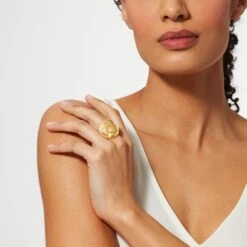 This timeless ring pays tribute to the expansive collection of coins in the Museum’s Greek and Roman art galleries. Silver and gold currency held intrinsic value during Greece’s Hellenistic period, and an elegant Early Hellenistic gold stater dating to around 323/2–315 B.C. has inspired this particular design. The detailing on the back of this particular coin indicates that it was produced at the royal mint of Amphipolis shortly after Alexander the Great’s death. Spectacular, sculptural coins bearing the likenesses of emperors, animals, and other pictorial scenes became fashionable in jewelry as far back as the 3rd century.