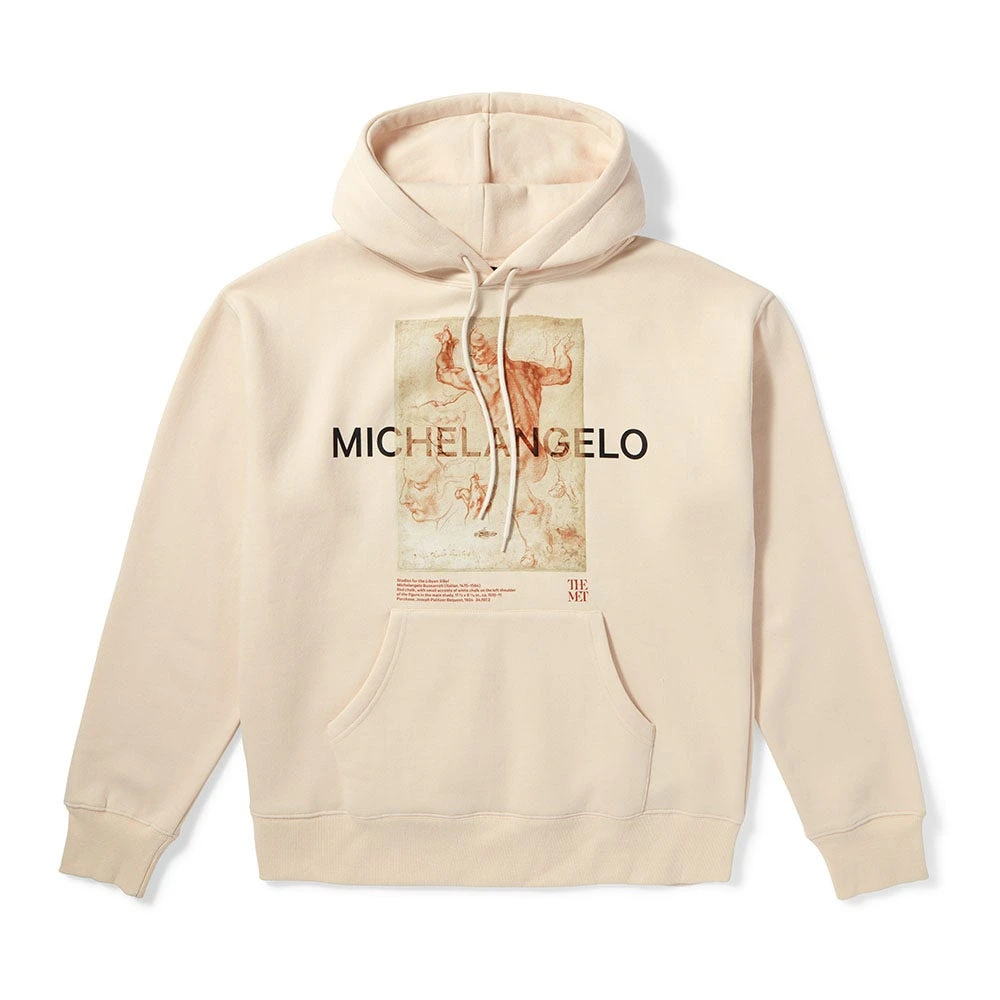 This cozy hooded sweatshirt showcases the spectacular red chalk studies for Michelangelo Buonarroti’s (Italian, 1475–1564) Libyan Sibyl, an enthroned woman painted on the northeast end of the Sistine Chapel ceiling. The final fresco exhibits a monumental female subject in a complex pose, clothed with the exception of her powerful shoulders and arms. The preparatory sketches (ca. 1510–11) in The Met collection were clearly drawn from a young male assistant in the artist’s studio.