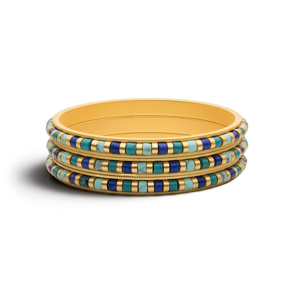 A section of an ancient Egyptian necklace in the Museum’s collection (Middle Kingdom, Dynasty 12, ca. 1878–1840 B.C.) features colorful cylindrical beads made of gold, lapis lazuli, and turquoise. This provides the basis for our striking bangles.
