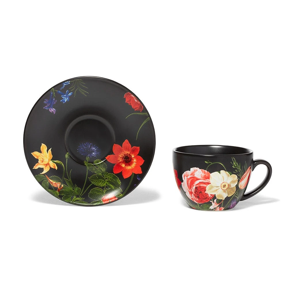 Our teacup and saucer features sumptuous details from Clara Peeters’s (Flemish, ca. 1587–after 1636) magnificent still life, A Bouquet of Flowers (ca. 1612), in The Met collection. Peeters was a founding figure in the history of European still-life painting, a genre that attracted women artists who were not allowed to study nude models.