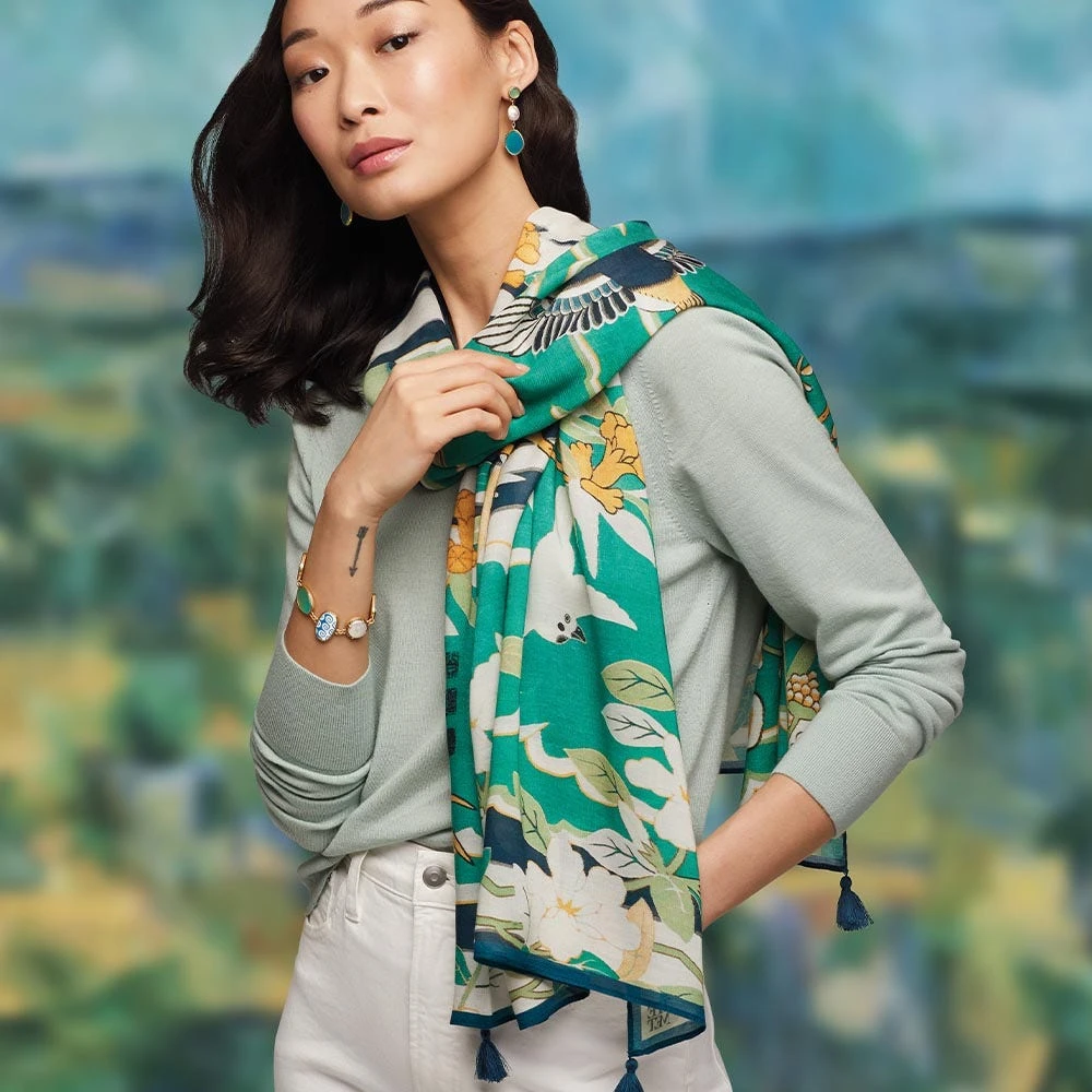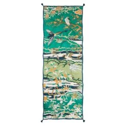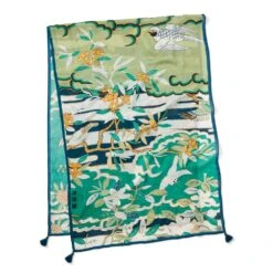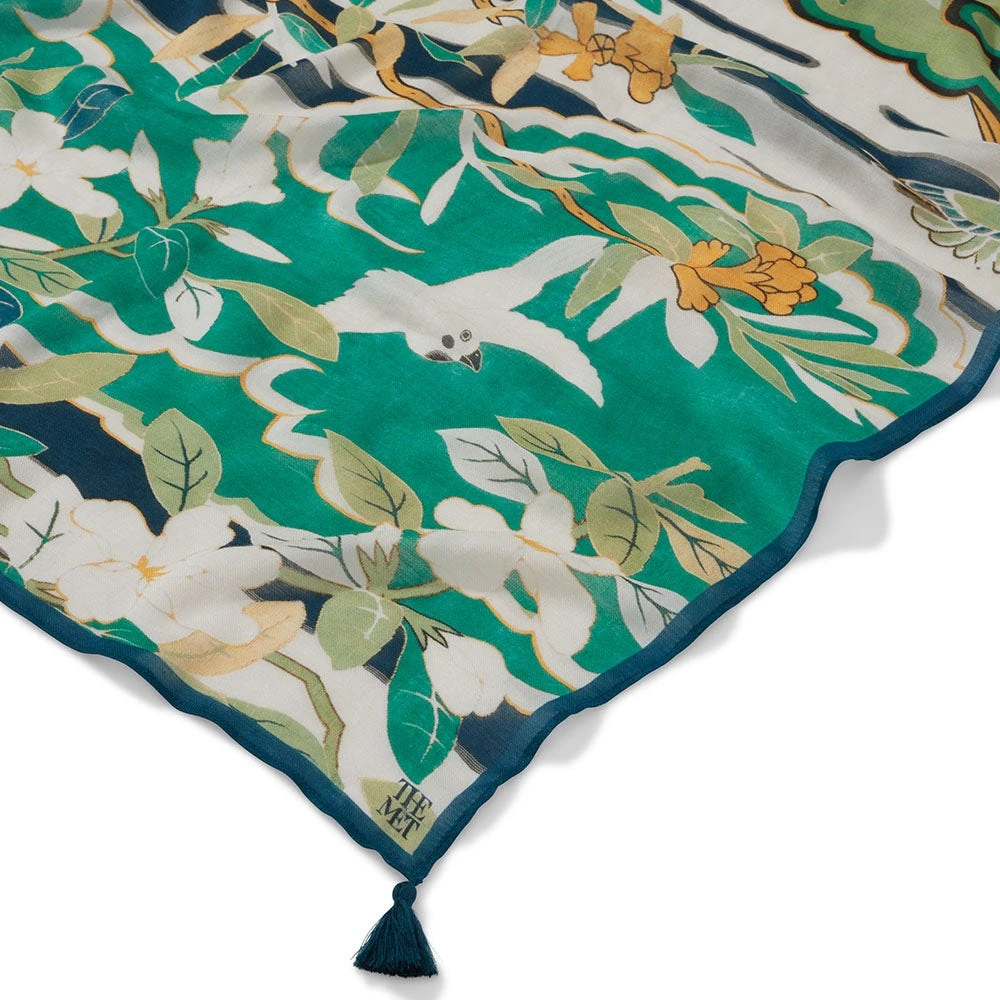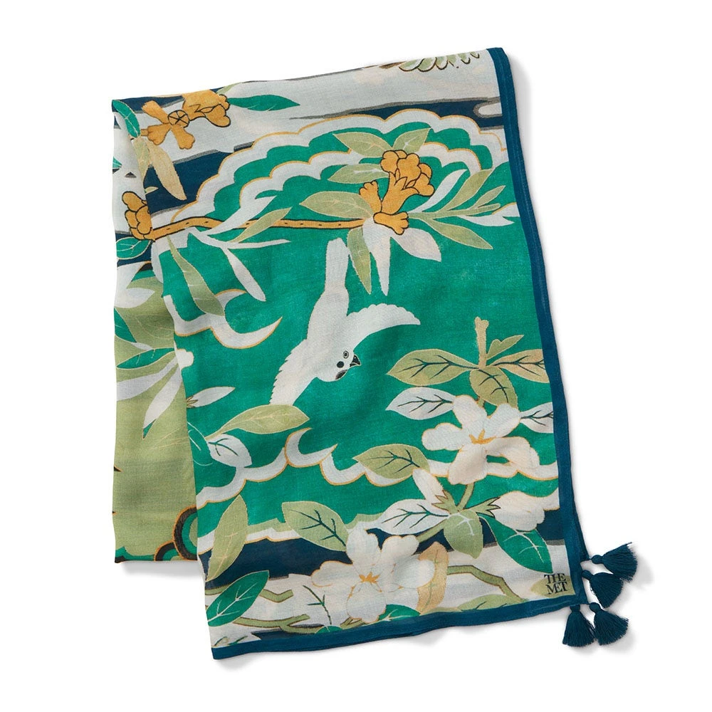 Elegant birds fly among flowering branches and swirling clouds in this idyllic scene adapted from a Ming dynasty–era tapestry. Crafted in 17th-century China and now in The Met collection, it was probably created as part of a larger decorative panel featuring hundreds of birds watched over by a phoenix. Said to appear in divine places, the mythological phoenix symbolized a righteous ruler with loyal officials.