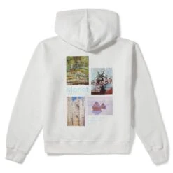 This artful hooded sweatshirt features a selection of paintings by the Impressionist painter and passionate horticulturist, Claude Monet (French, 1840–1926): Chrysanthemums (1882), a still life exhibited at the Galerie Durand-Ruel in Paris in 1883 and again with the avant-garde artists’ circle Les XX in Brussels in 1886; Haystacks (Effect of Snow and Sun) (1891), in which he endeavored to capture the subject’s complex qualities in shifting daylight; Rouen Cathedral: The Portal (Sunlight) (1894), one of many views that he painted of the architectural wonder; and Bridge over a Pond of Water Lilies (1899), a peaceful view of the pond and footbridge near his home in Giverny.