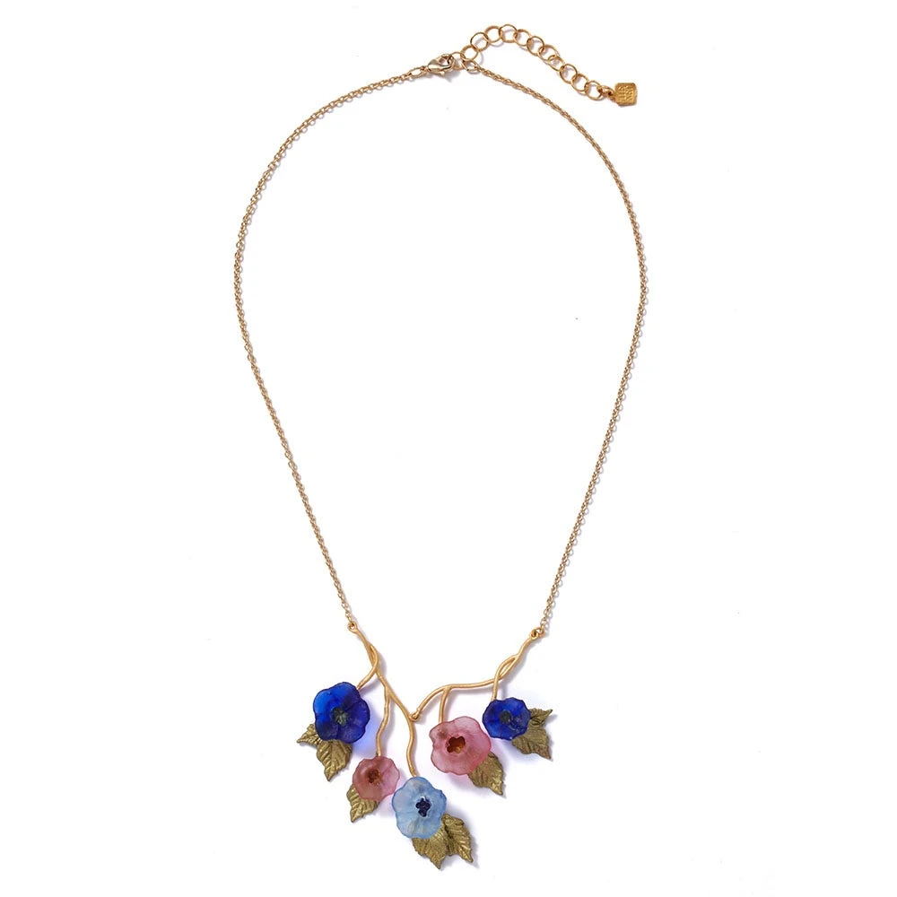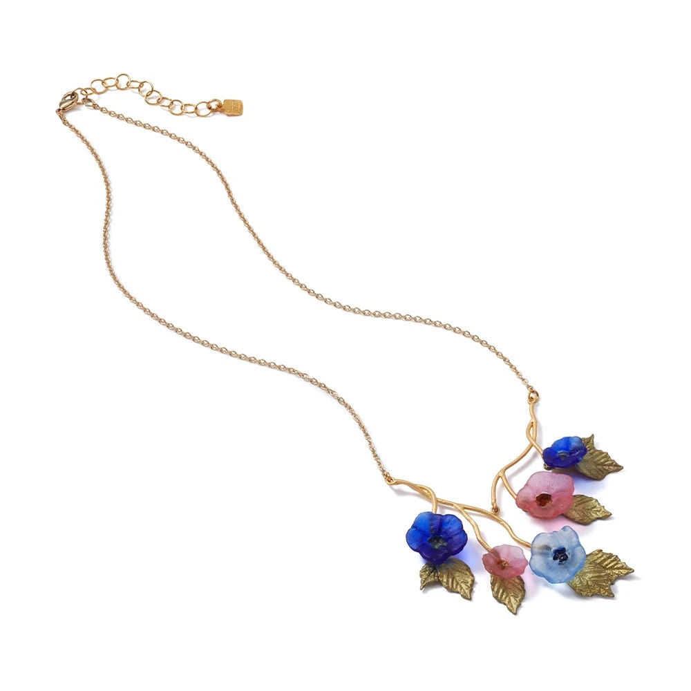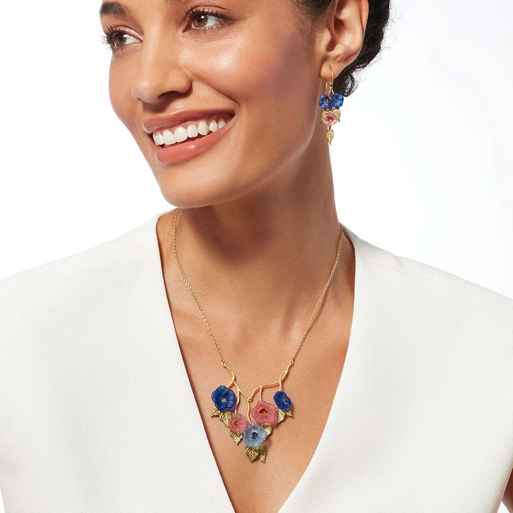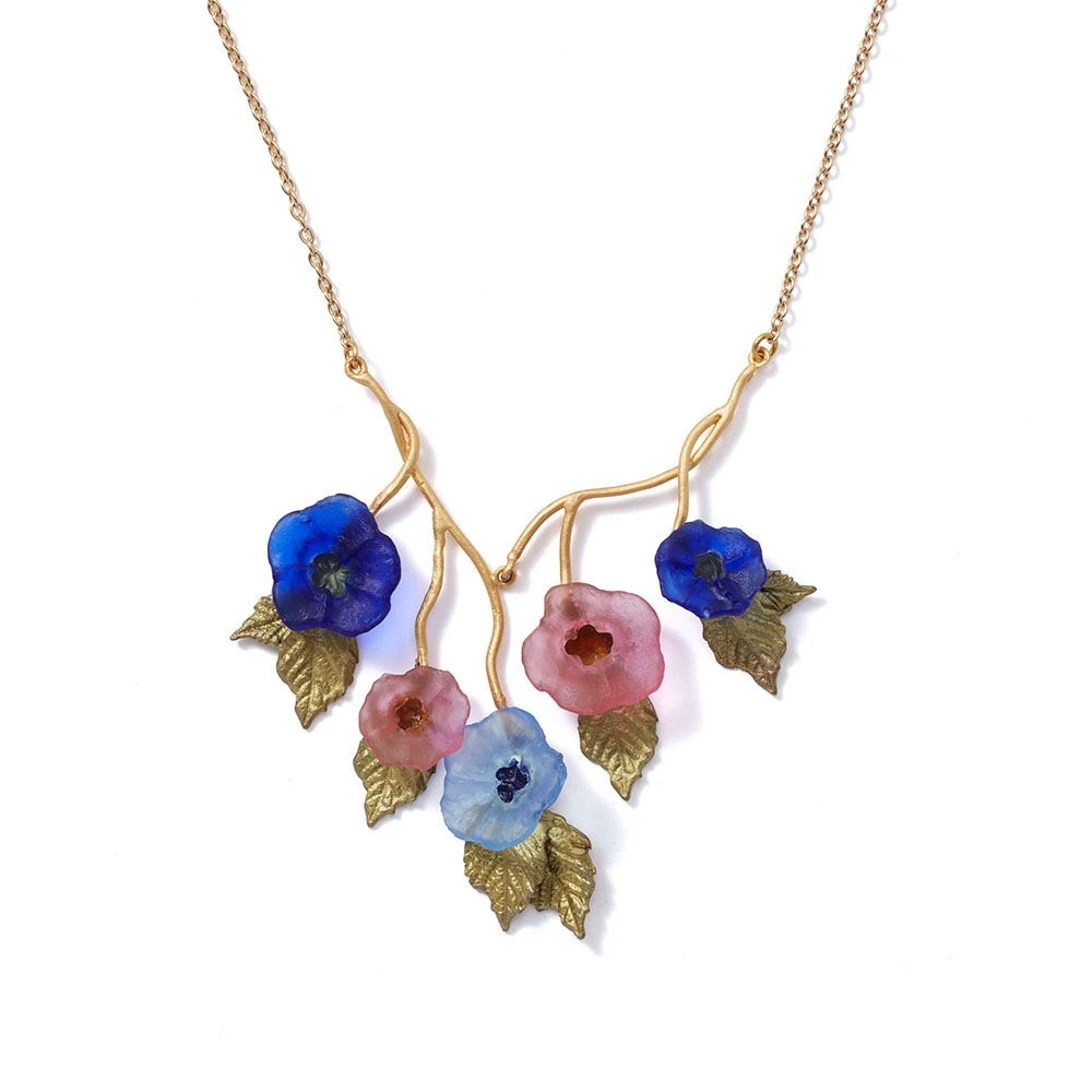 The pretty cast-glass flowers adorning this necklace celebrate the floral motif on a Favrile glass vase by Louis Comfort Tiffany (American, 1848–1933). Formerly in the designer’s own private collection, it was among a group of items loaned to The Met in 1925, and later given to the Museum in 1951. This luminous vessel was part of a series depicting morning glories; the first one was exhibited at the Exposition Universelle in Paris in the year 1900.