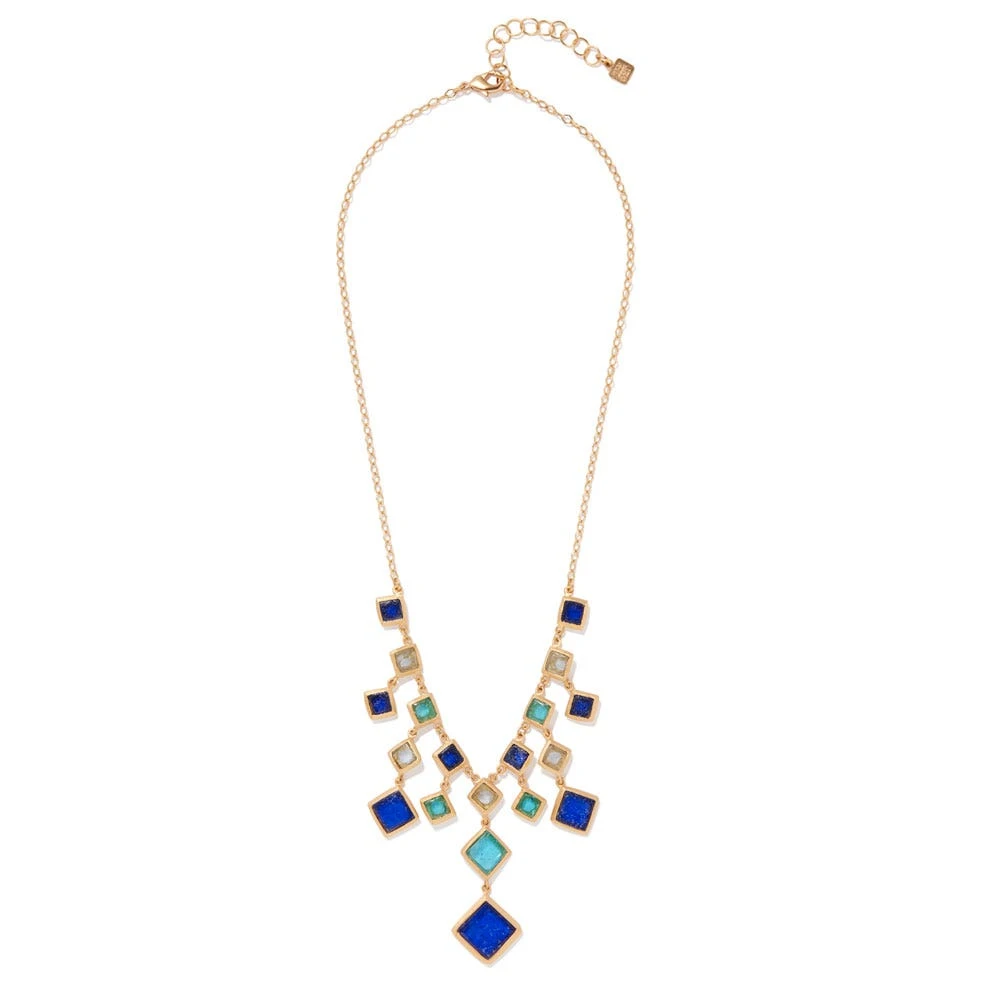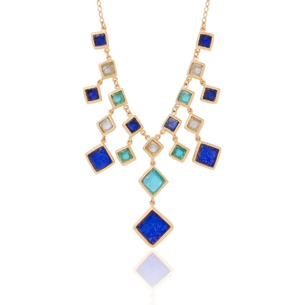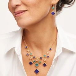 With cascading pendants in luminous shades of blue, our elegant bib necklace celebrates a beautiful mosaic column in The Met collection by Louis Comfort Tiffany. The necklace’s chic design features 18K gold plate and recycled glass stones for a contemporary look. Inspired by Byzantine mosaics, the shimmering column, now in the American Wing at The Met, displays L. C. Tiffany’s great artistry and expertise in the medium of glass.