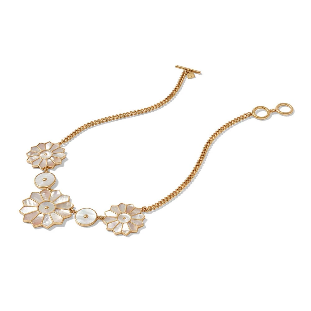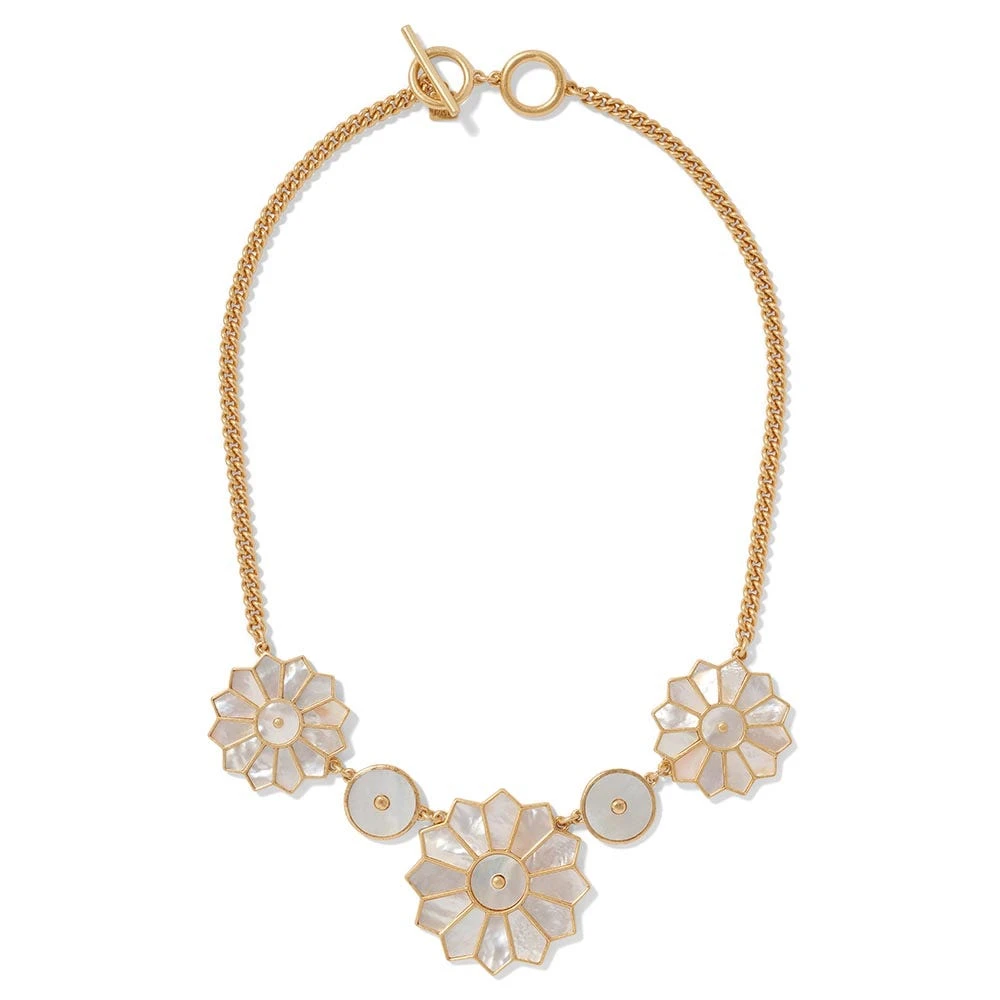 Our mother-of-pearl statement necklace celebrates a lustrous Indian powder flask (18th–19th-century) in The Met collection. Crafted in Gujarat for the export market, this artful vessel of shimmering green turban shell was created to contain gunpowder. The Museum is home to a vast collection of diversely decorated powder flasks from around the world.