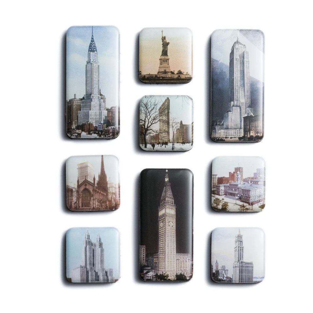 These miniature magnets feature images of New York City landmarks reproduced from vintage postcards in the Museum’s Burdick Collection.