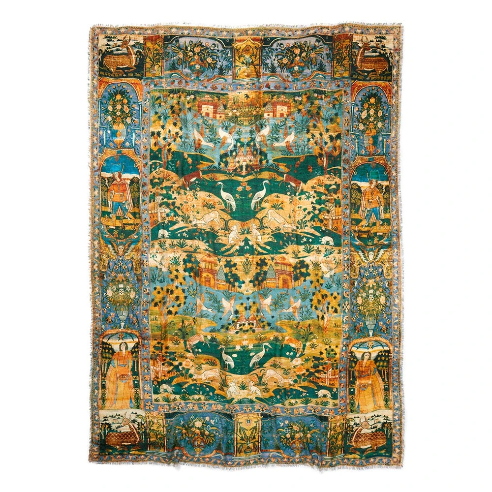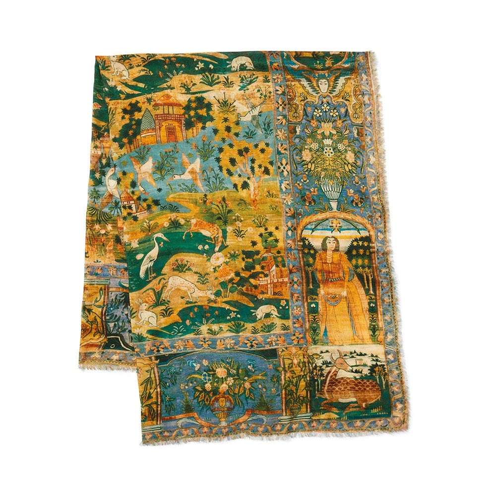 This striking oversize scarf evokes a spectacular pictorial carpet made in 17th-century Iran and housed at The Met. Featuring a European pictorial perspective and border compartments inhabited by figures in European-style dress, the textile’s composition is evidently inspired by contemporary Flemish tapestries; however, the technique and execution are distinctly of the Safavid court. The carpet’s Western influence indicates that it may have been woven in Iran for export or, perhaps, intended as a diplomatic gift.