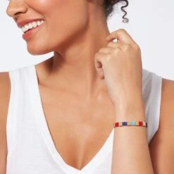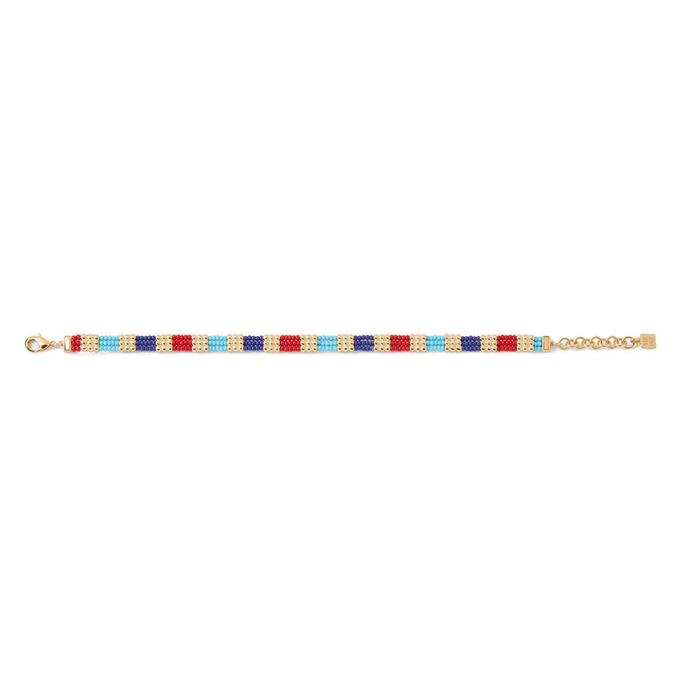 This colorful beaded bracelet reinterprets an ancient Egyptian necklace with shell pendants (1859–1770 B.C.) in The Met collection. This exceptional adornment was formerly in the possession of a noblewoman named Senebtisi, whose mummy was discovered with exquisite ritual jewelry suggesting an association with royalty. The discovery of her remarkable tomb was revelatory at the time of its excavation in the early 20th century.