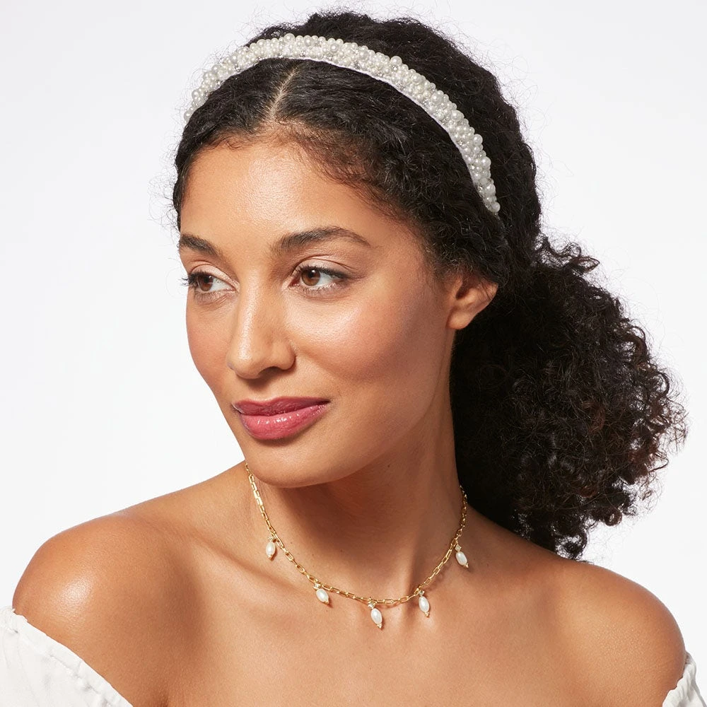 This regal headband reimagines the spectacular pearl adornments worn by Ellen Maurice in Marcus Gheeraerts the Younger’s portrait (1597) at The Met. The Welsh heiress is poised in a dramatic dress embellished with lustrous pearls, which were known as the “Queen of gems” in the Elizabethan era. Gheeraerts was the preeminent painter in the late Elizabethan and early Jacobean courts, esteemed for the way he so masterfully rendered sumptuous fabrics and sparkling jewels.