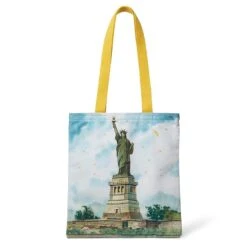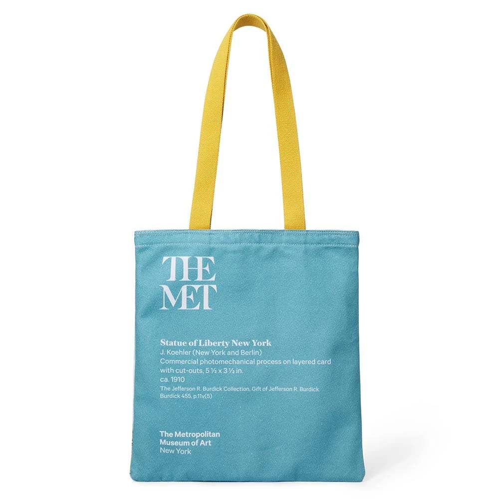 Our canvas tote features a detail from The Great Bartholdi Statue – Liberty Enlightening the World (1885), a hand-colored lithograph in The Met collection. Frédéric-Auguste Bartholdi’s (French, 1834–1904) world-famous statue was created as a gift of friendship from France to the United States, and arrived in New York Harbor in 1885. That same year, the celebrated New York printmaking firm Currier & Ives (American, 1857–1907) captured the landmark in a grand, aerial vista including Manhattan, parts of the Brooklyn, and the New Jersey shoreline.