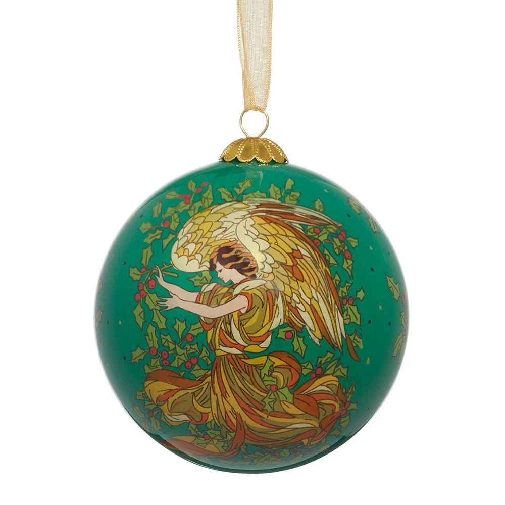 An ethereal angel created by illustrators Carl Tait (American, 1917–2011) and Lloyd Henson (American, n.d.) floats weightlessly against a verdant background in Angel of the Evergreens (1964), a detail of which is celebrated on this hand-painted glass ornament.
